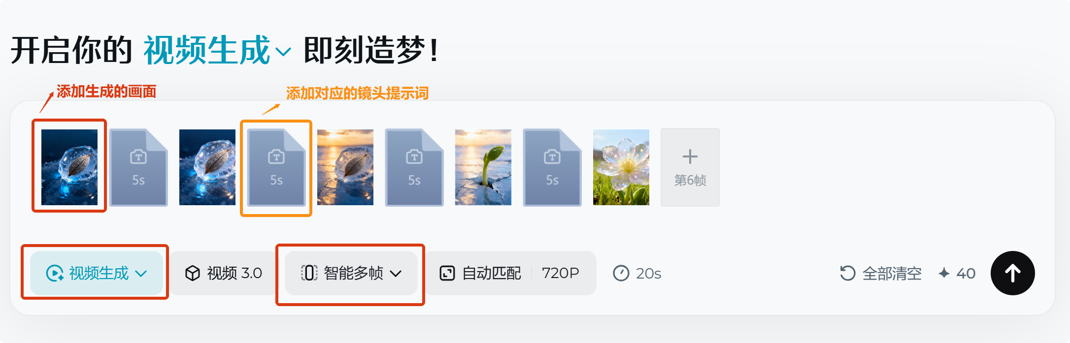 在即梦的「视频生成」中,将5个画面分别设置为关键帧,并添加对应镜头的提示词
