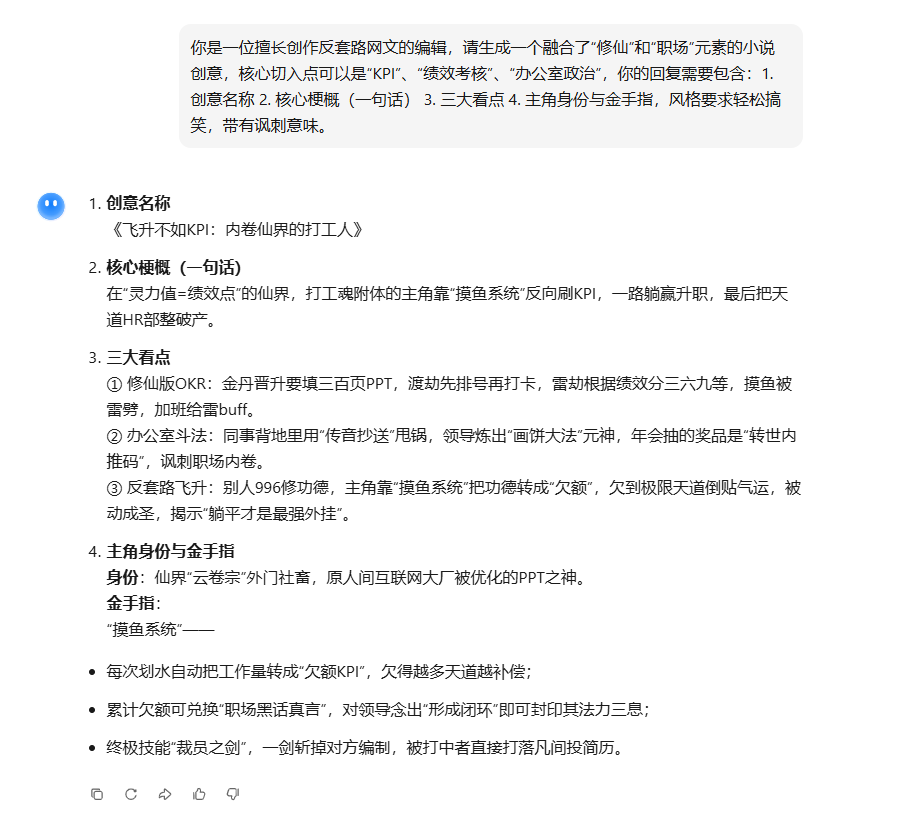 - R (要求):“请生成一个融合了“修仙”和“职场”元素的小说创意。”