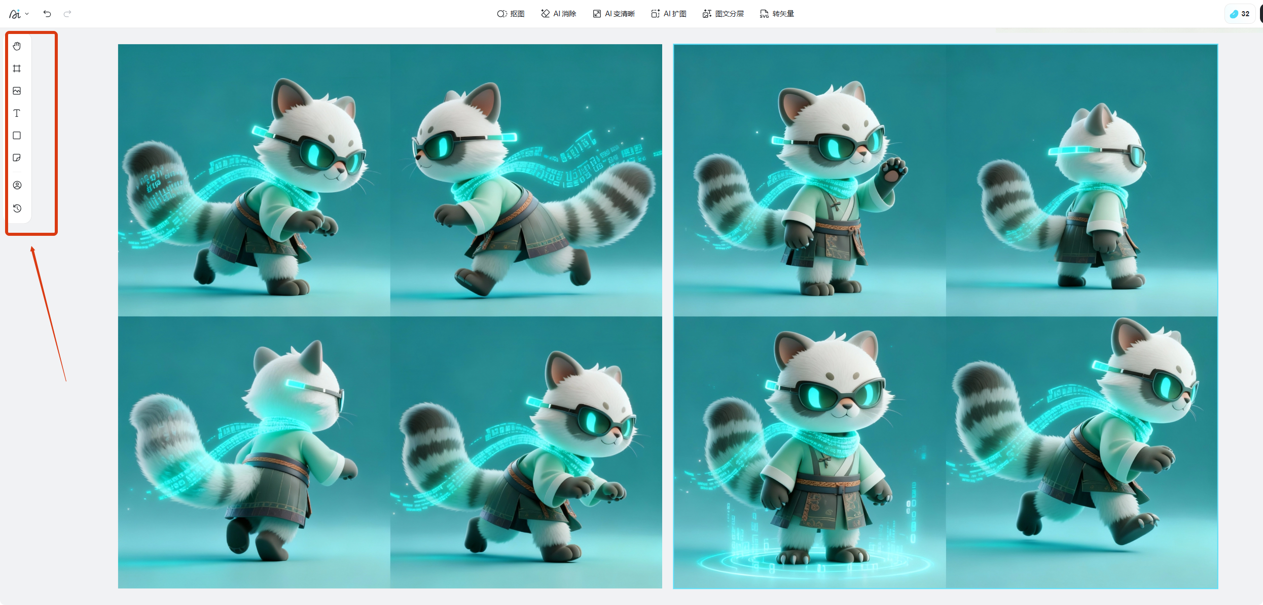 画布:支持深度编辑的专业创作区域,集成了多种AI与常规编辑工具。