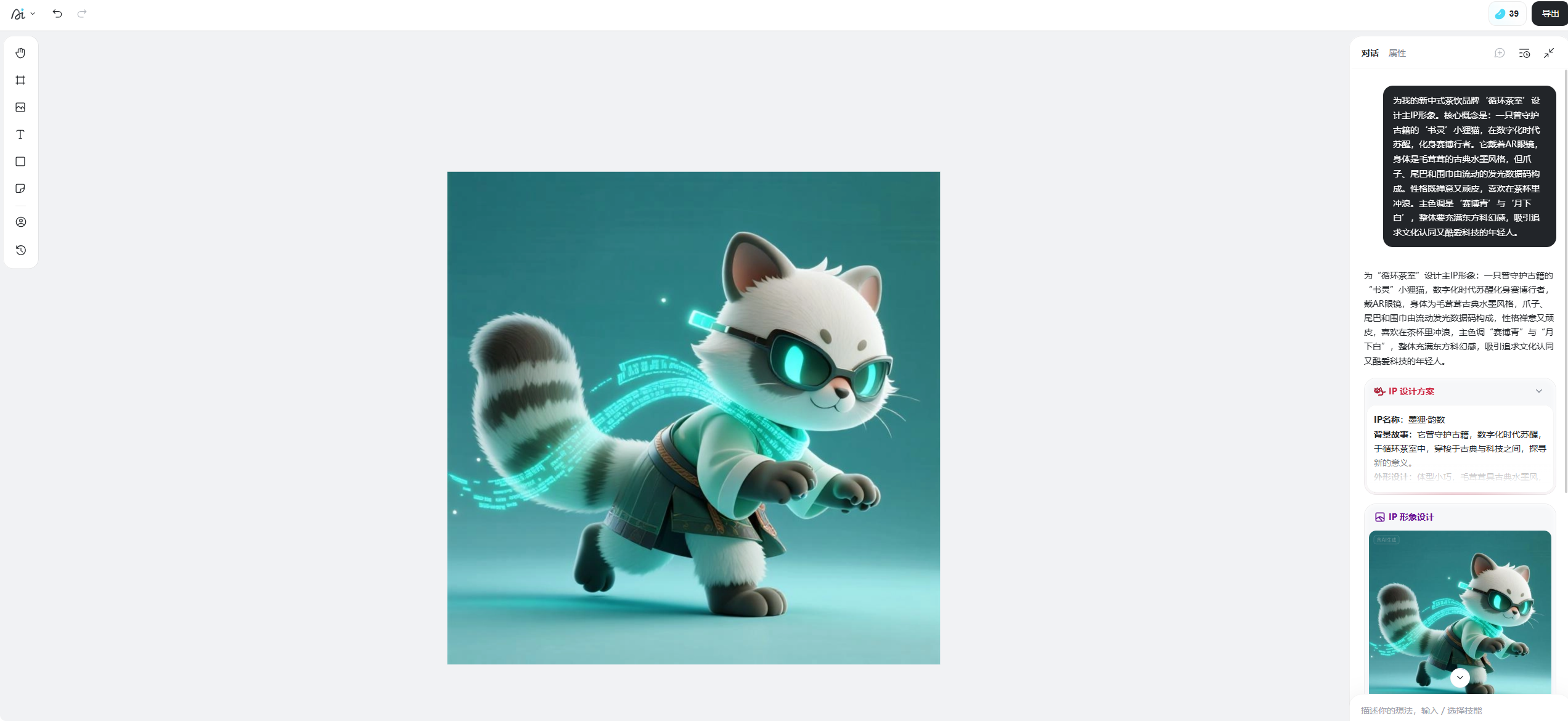 优秀示例:“为我的新中式茶饮品牌‘循环茶室’设计主IP形象。核心概念是:一只曾守护古籍的‘书灵’小狸猫,在数字化时代苏醒,化身赛博行者。它戴着AR眼镜,身体是毛茸茸的古典水墨风格,但爪子、尾巴和围巾由流动的发光数据码构成。性格既禅意又顽皮,喜欢在茶杯里冲浪。主色调是‘赛博青’与‘月下白’,整体要充满东方科幻感,吸引追求文化认同又酷爱科技的年轻人。”
