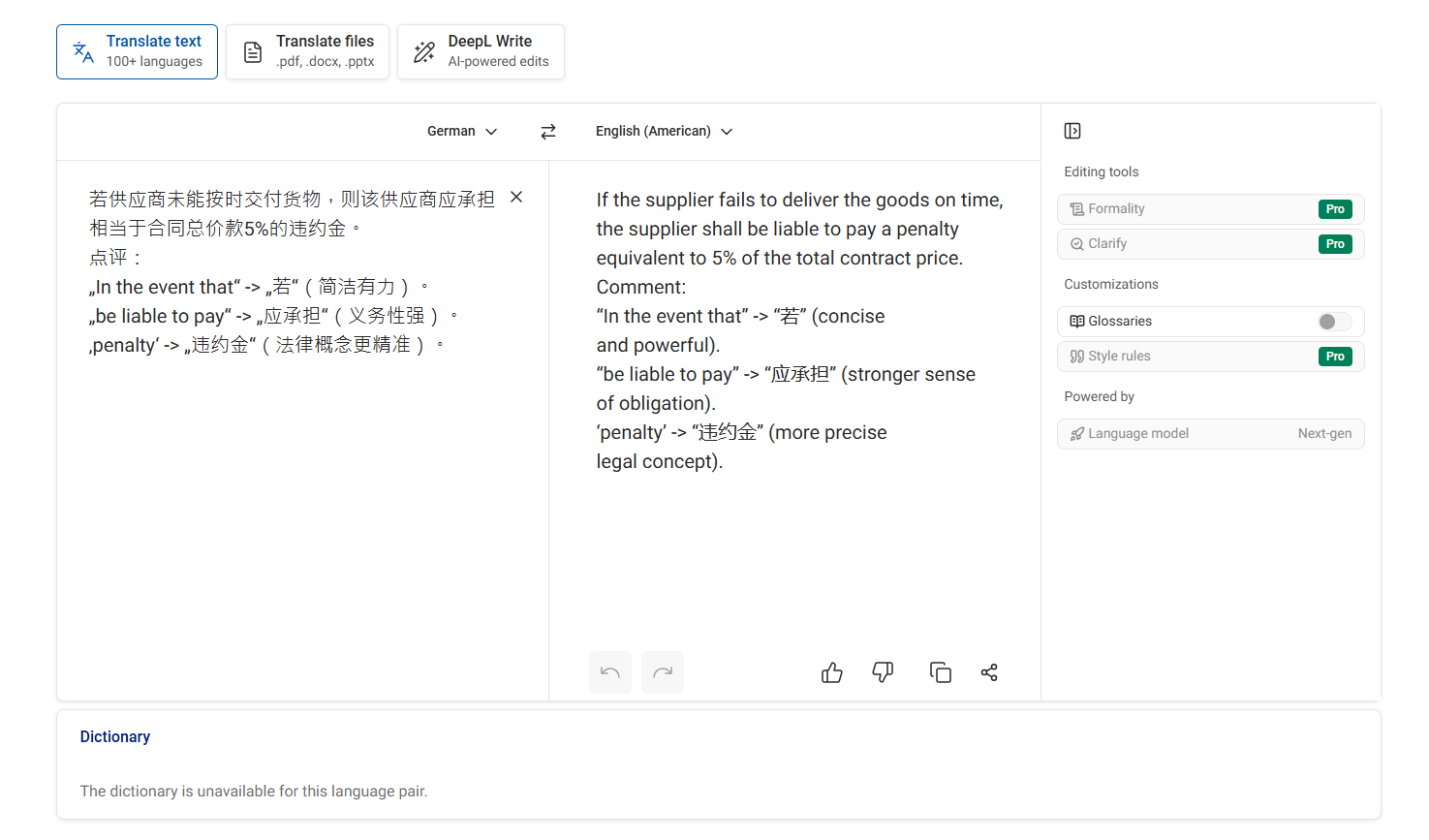 在DeepL中预设好特定的法律词汇,防止AI随意发挥。