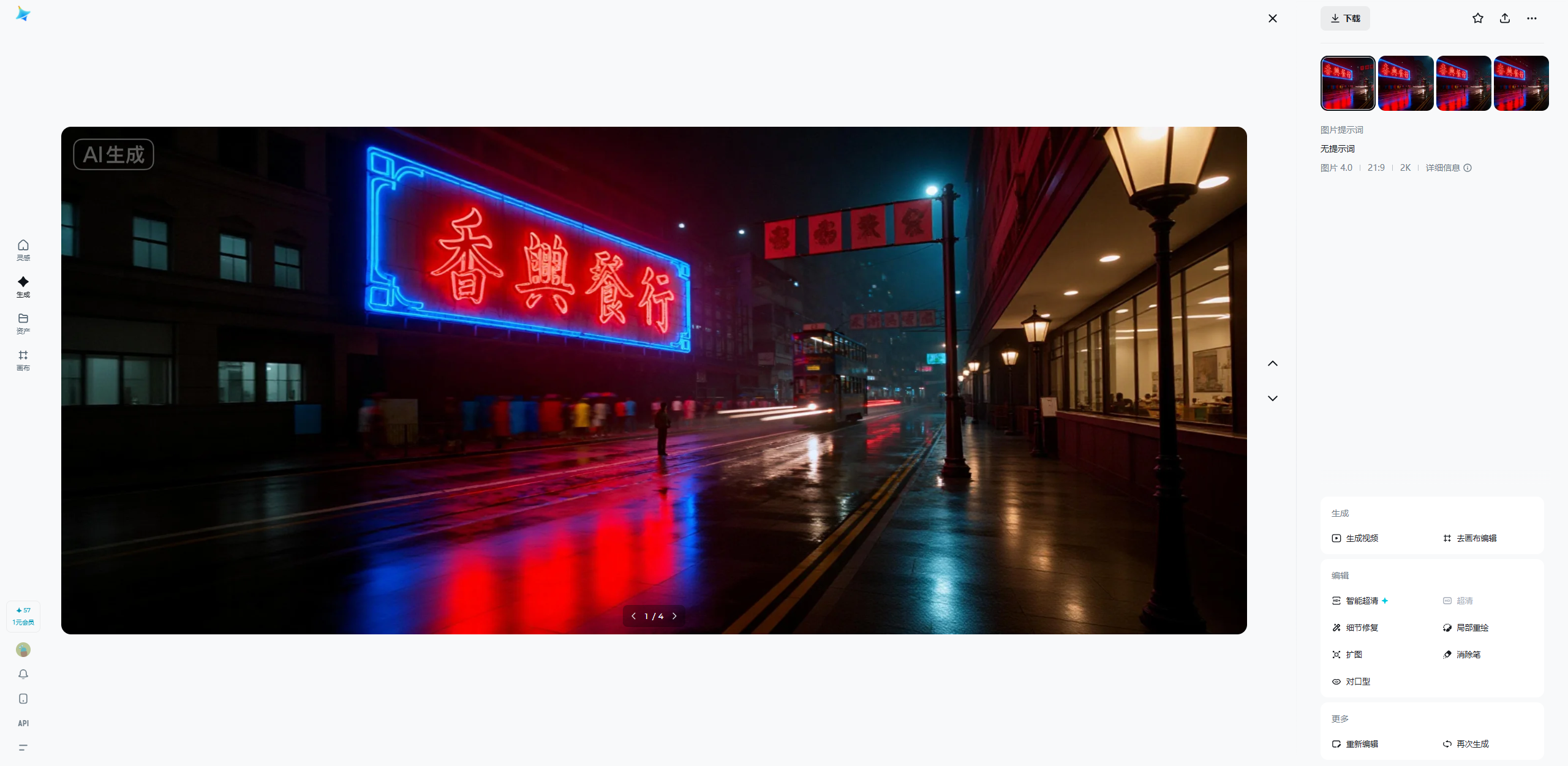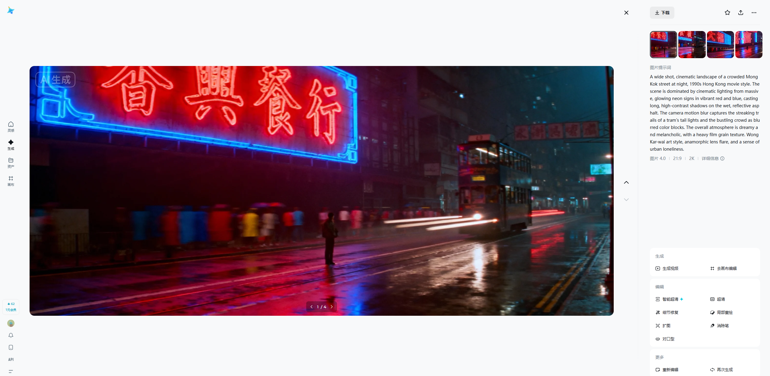 在下篇文章中,我给大家介绍如何把这几张静止的图片,扔进「可灵 AI」,让霓虹灯闪烁、让烟雾缭绕、让人物眼神流转。如何利用剪辑工具进行「卡点」剪辑,配合复古 BGM,完成最终的 90 年代港风 MV。