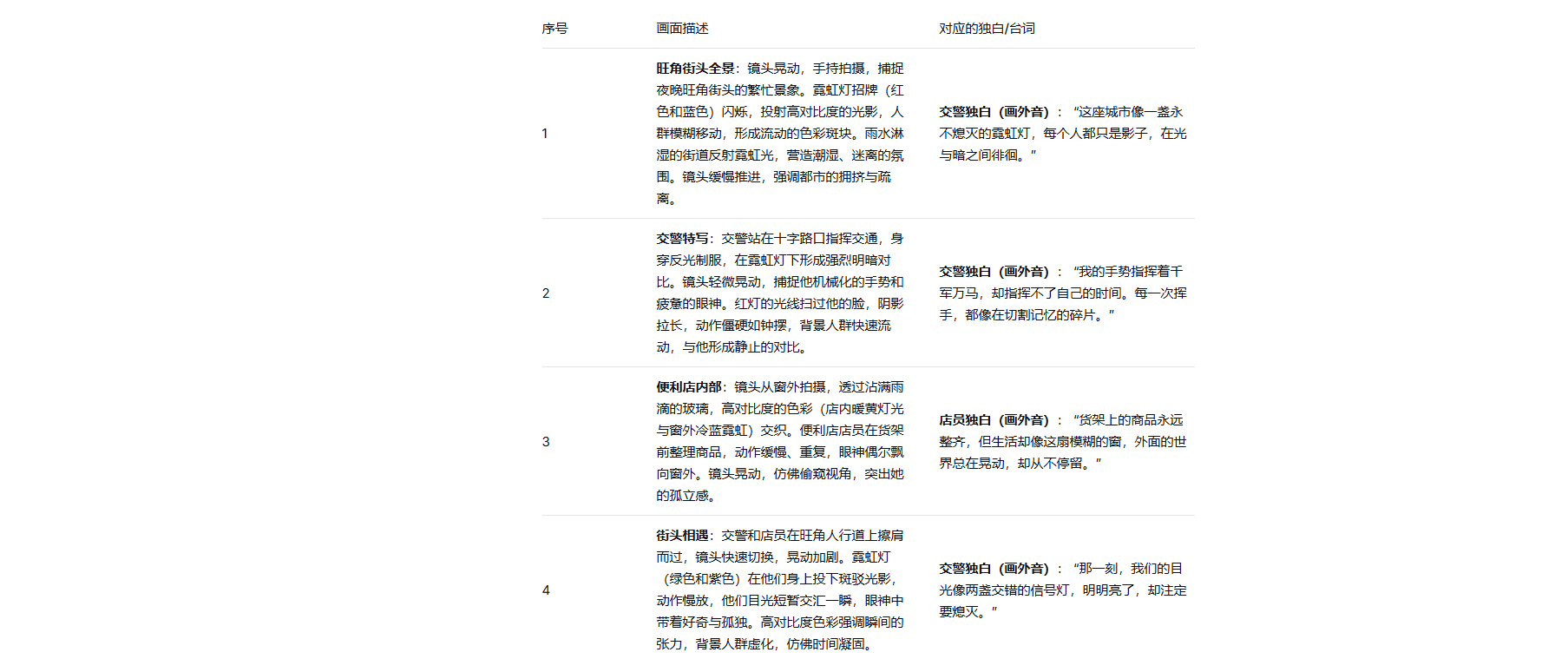 输出要求: 请按表格形式输出,包含序号、画面描述(详细到光影和动作)、对应的独白/台词。