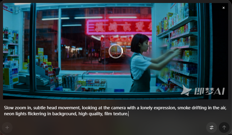 提示词: Slow zoom in(缓慢推镜头), subtle head movement(头部轻微转动), looking at the camera with a lonely expression(孤独地看向镜头), smoke drifting in the air(空气中烟雾缭绕), neon lights flickering in background(背景霓虹灯闪烁), high quality, film texture.