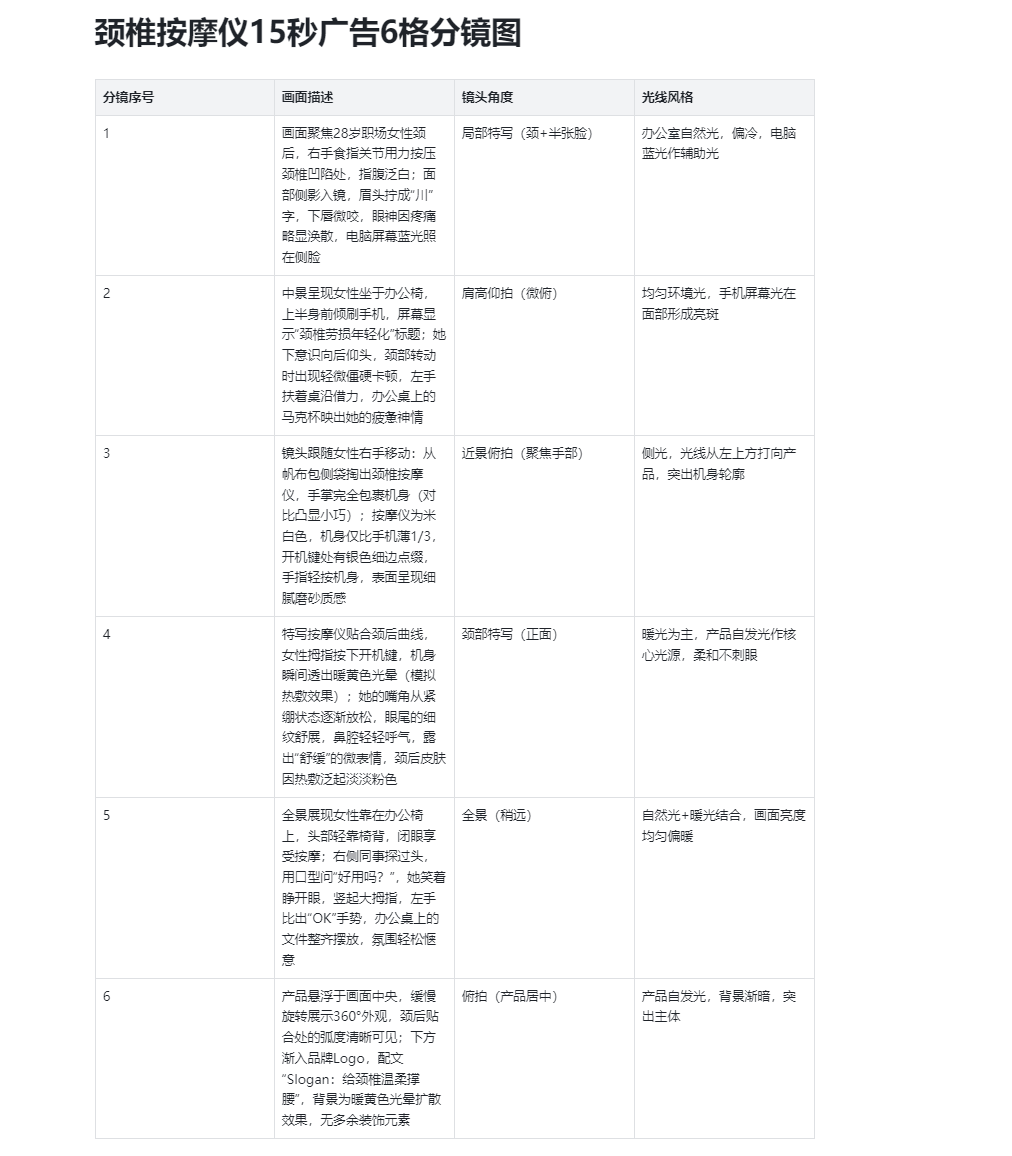 根据下面脚本,生成 6 格广告分镜图,每格包含:画面描述、镜头角度、光线风格。脚本内容:【此处粘贴你写好的15秒脚本】