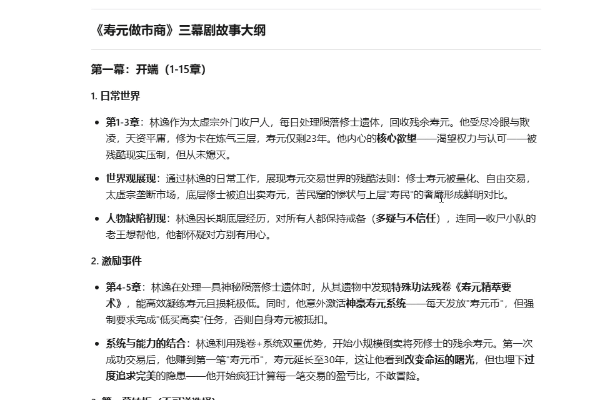 - 对于不满意的部分,直接指令AI修改。例如:“第二幕的“上升冲突”不够激烈,请提供更具毁灭性的挑战方案。”
