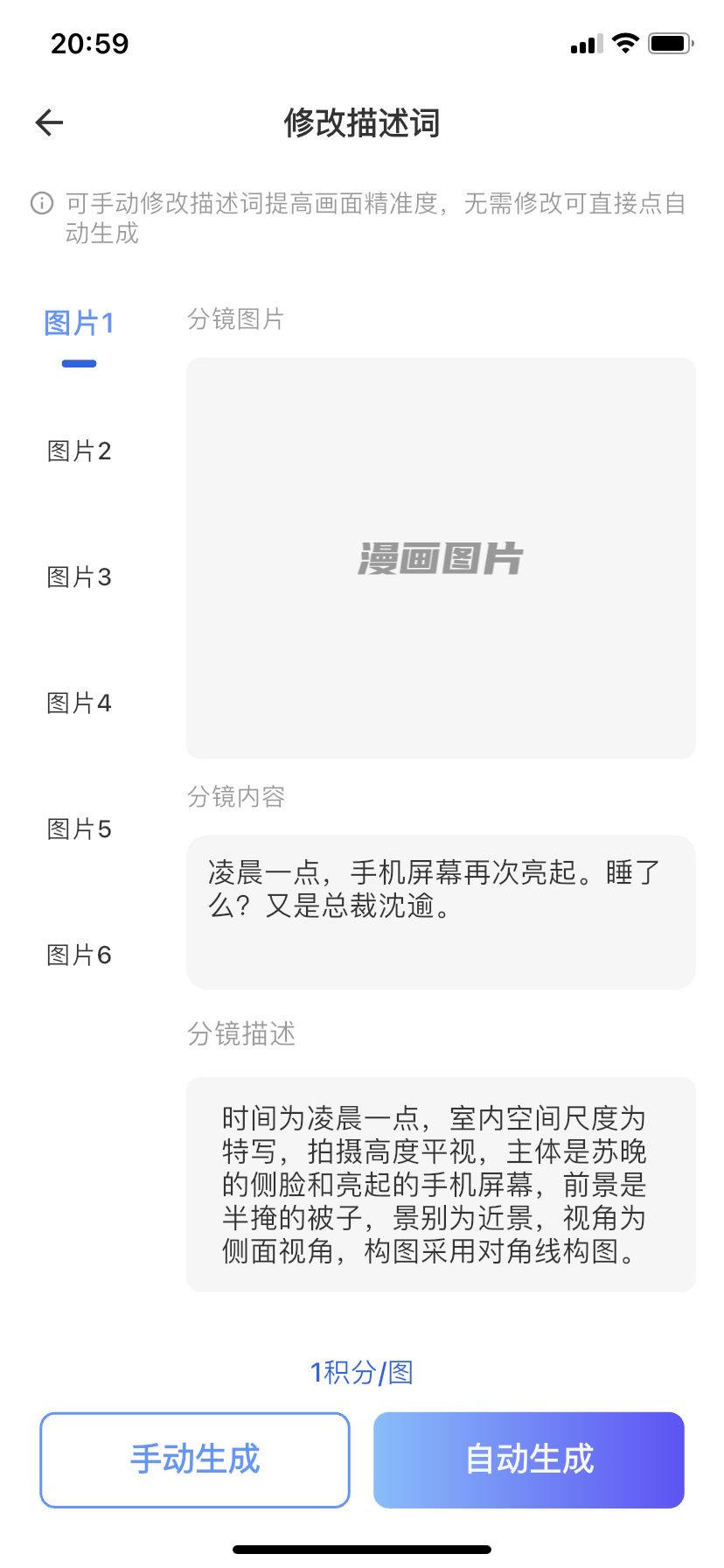 - 分镜描述:AI生成的图像提示词,创作者可基于自身理解进行优化修改