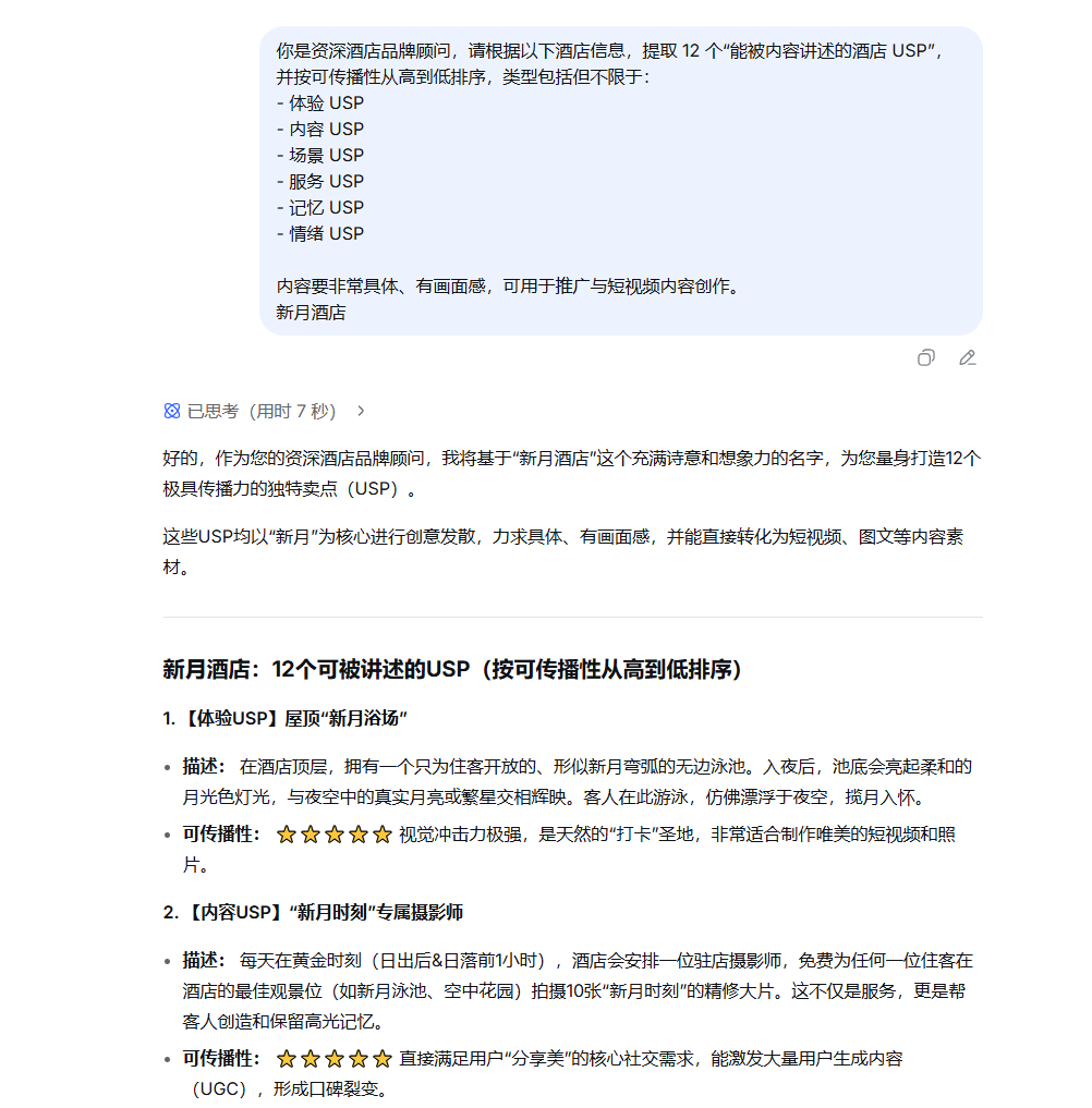 但 AI 能帮你快速提取酒店所有潜力 USP(Unique Selling Proposition)。