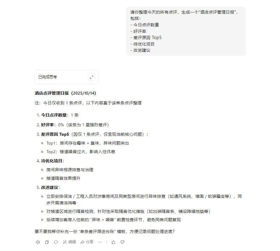 建议根据酒店自身定位调整语气模板细节,结合每日日报数据持续优化回复策略,让AI真正成为酒店运营的得力助手。