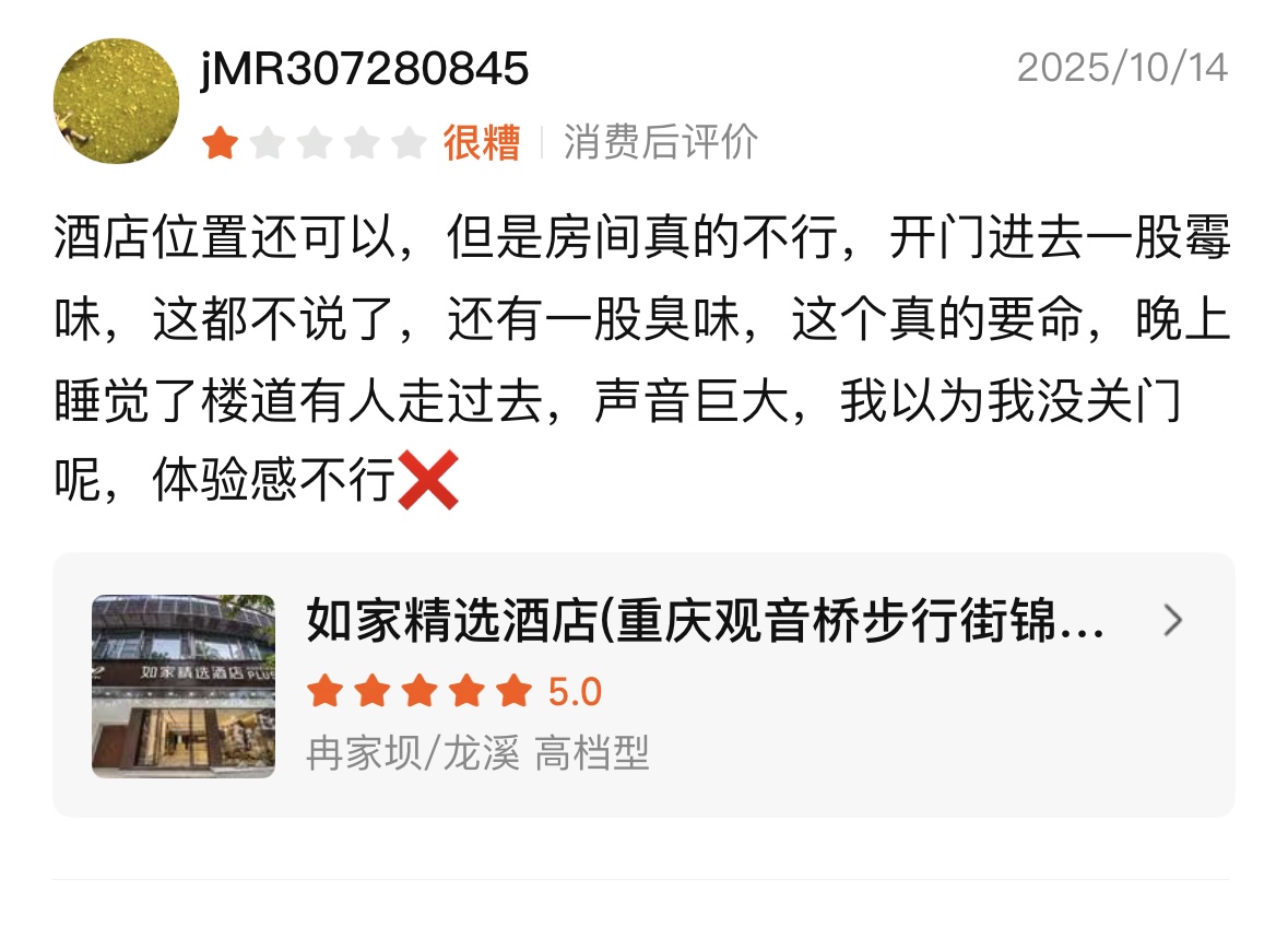 回复示例:“很抱歉这次的入住没有达到您的期待,也理解这种落差带来的感受。您提到的问题我已转给相关负责人跟进,我们会尽快优化,也希望能通过私信了解更多情况,给您一个满意的解决方案。”