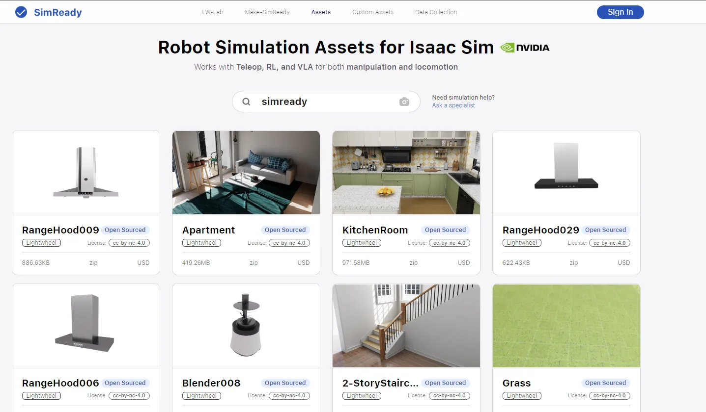 从 Lightwheel 的资产库或 NVIDIA 开源物理 AI 数据集下载资产,在 NVIDIA Isaac Sim 中进行试用。