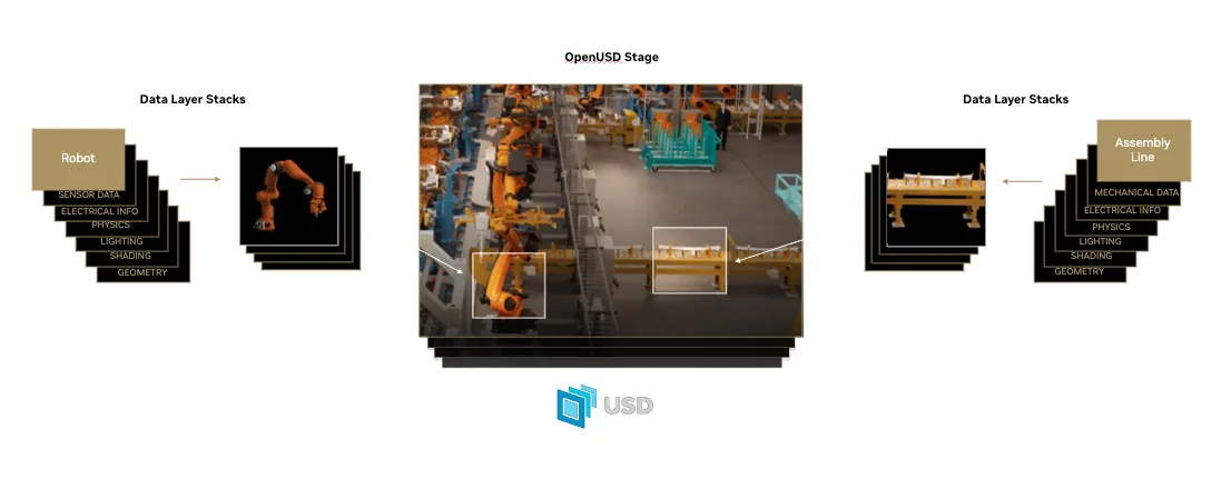 数据聚合利用 USD 的基于层的合成能力,将来自不同数据源的模块化、可复用资产,整合为有序、可扩展且高性能的虚拟世界。
