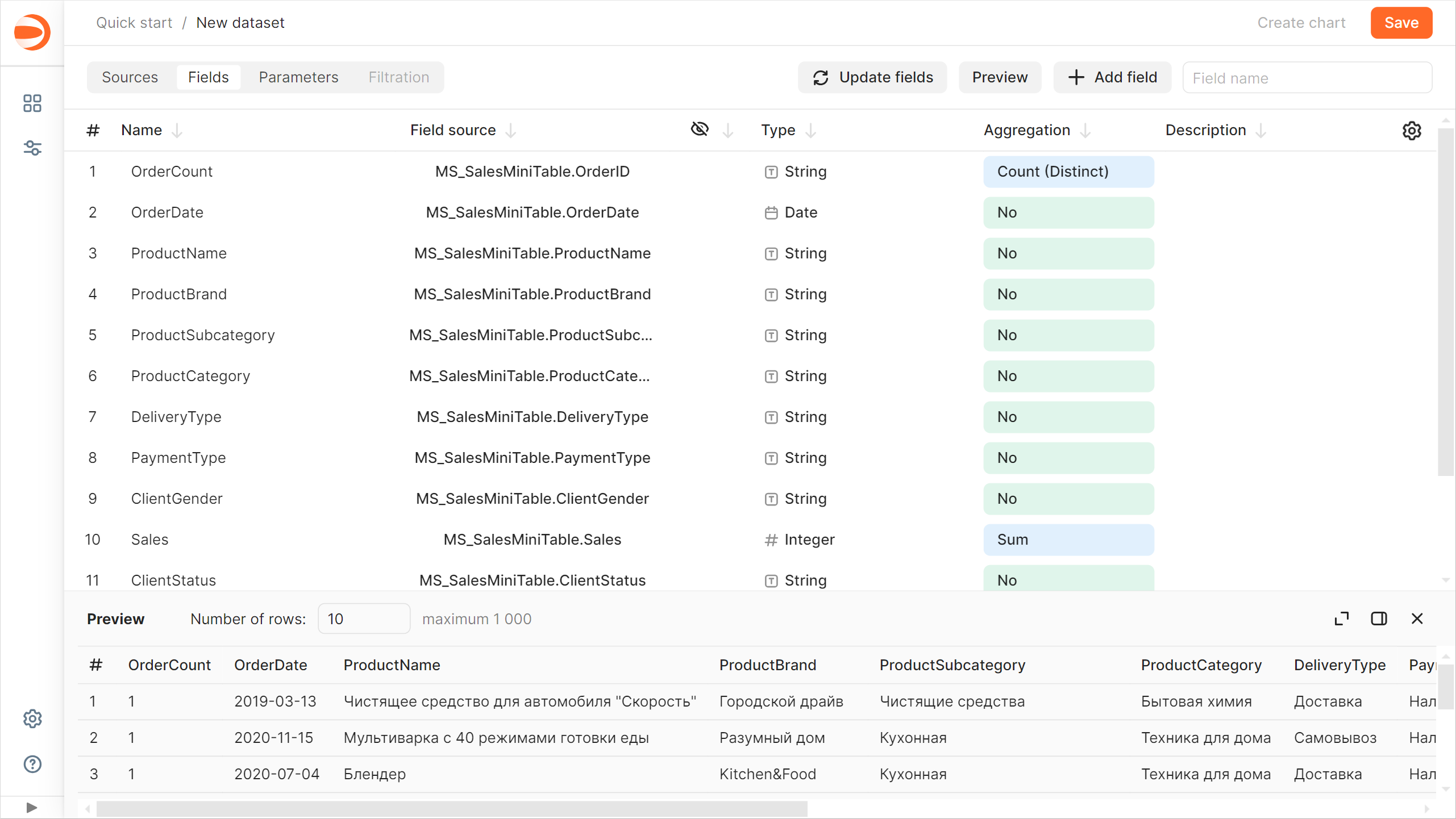 •在 “聚合” 列中,为 OrderCount 字段选择 “唯一计数”。