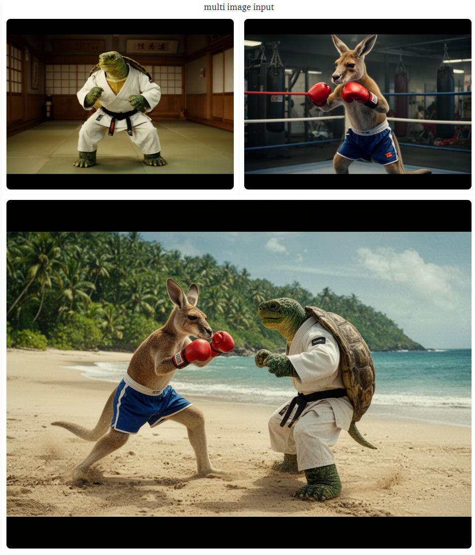 FLUX.2 支持最多 10 张图像作为参考输入(每张新增图像会增加显存占用)。可通过索引(如 “image 1”“image 2”)或自然语言(如 “袋鼠”“乌龟”)引用参考图像,建议结合两种方式以获得最佳效果: