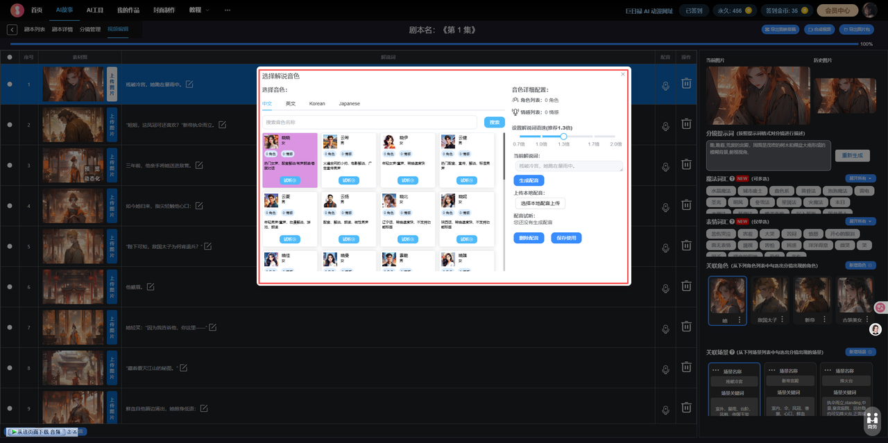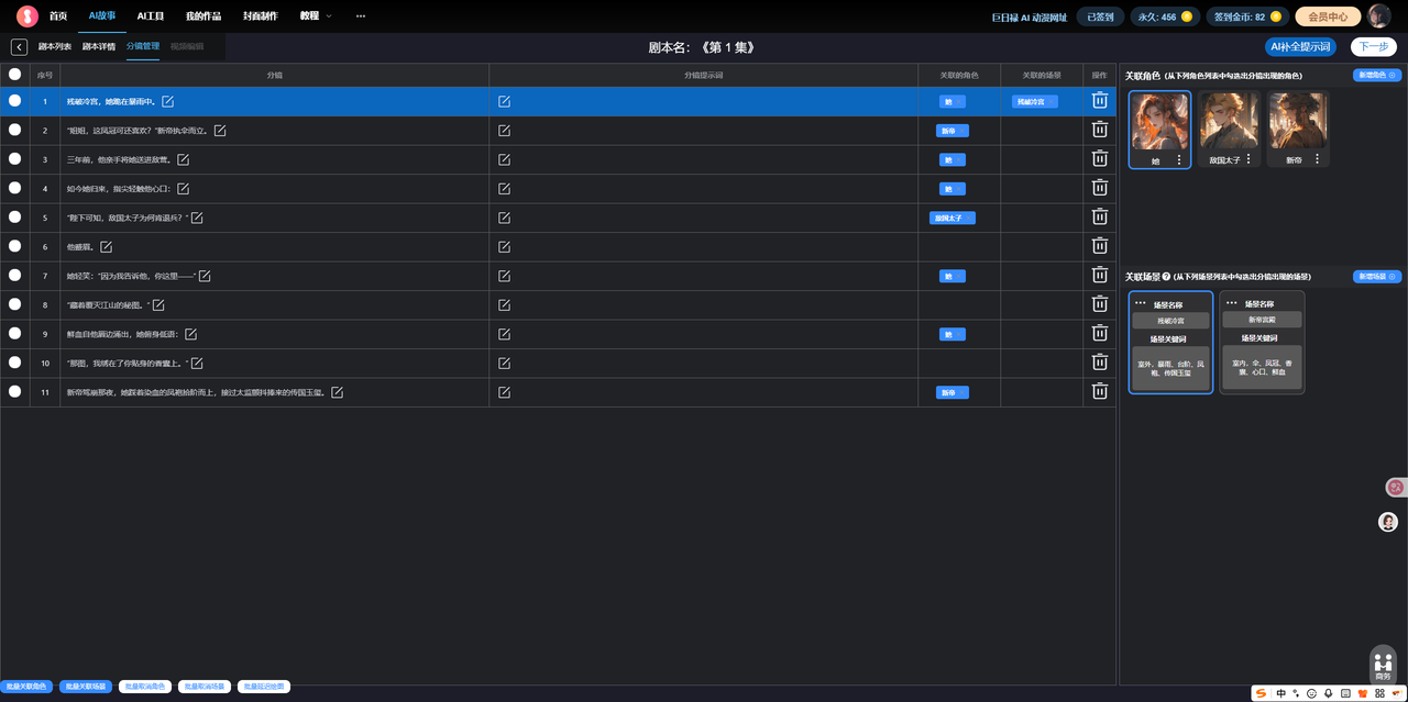 关联角色:为每个分镜关联出现的人物,通过关键词描述,系统为你自动生成(需要多次抽卡,系统生成的角色有点垃)。