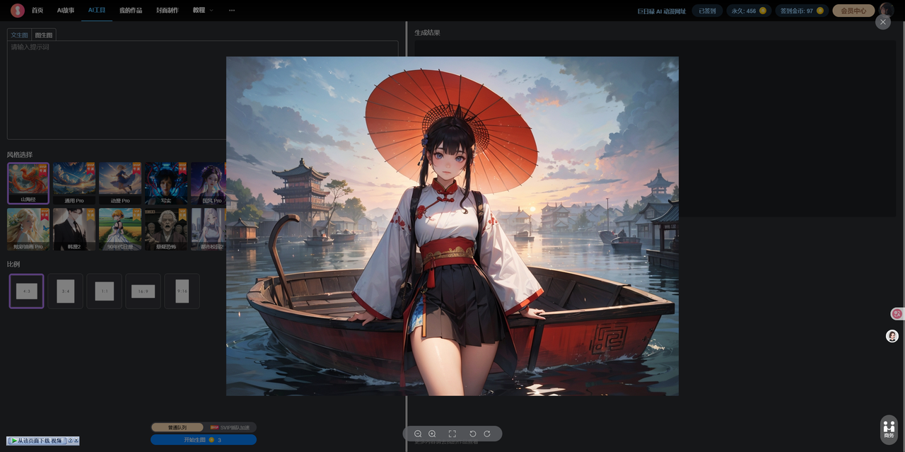 古风画风出现现代元素(如现代建筑) | 关键词未明确 “排除现代元素”,平台默认素材库可能混入其他风格 | 关键词中添加 “无现代建筑、纯古风场景”,必要时补充 “参考宋代 / 唐代建筑风格” |