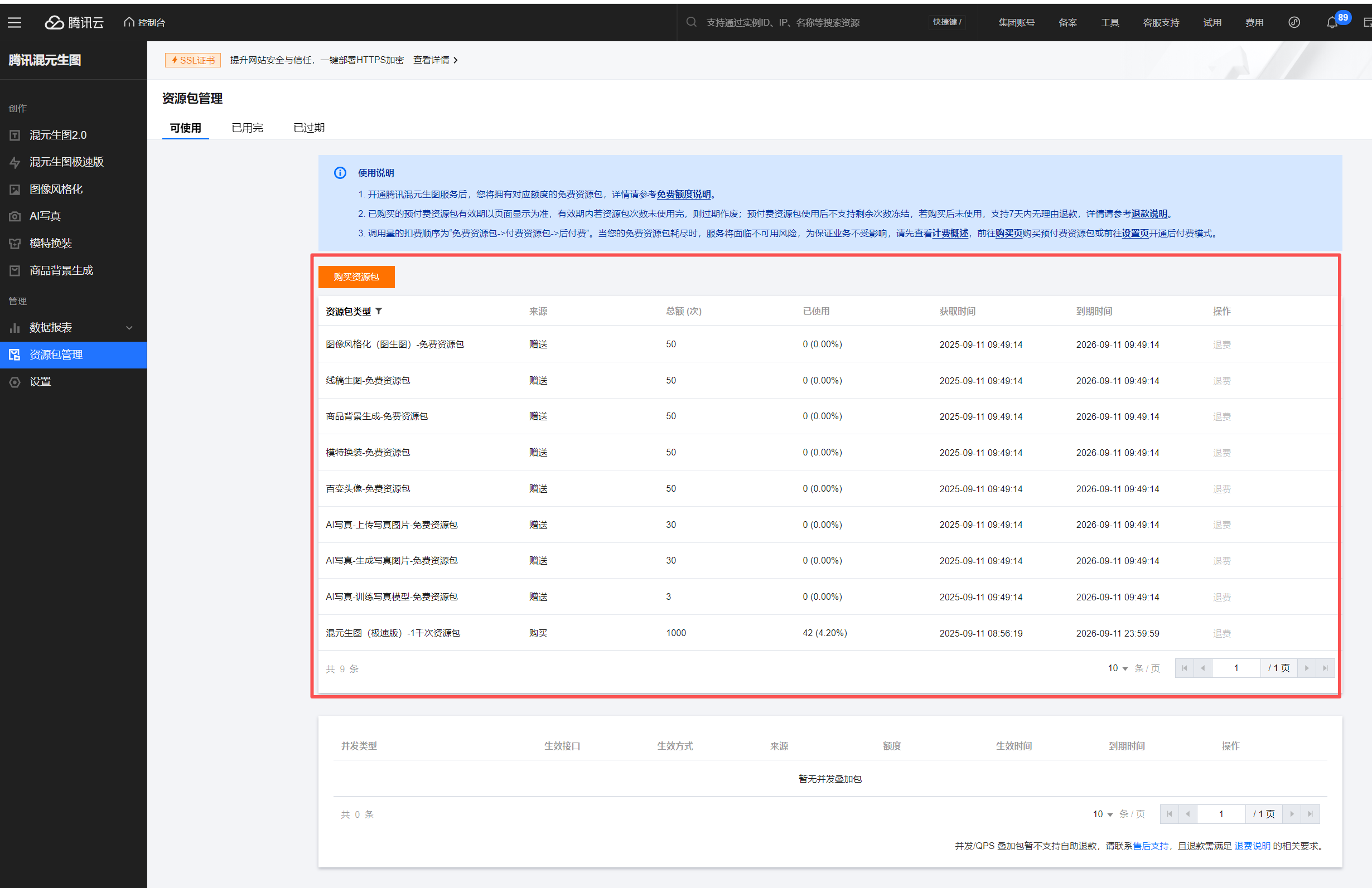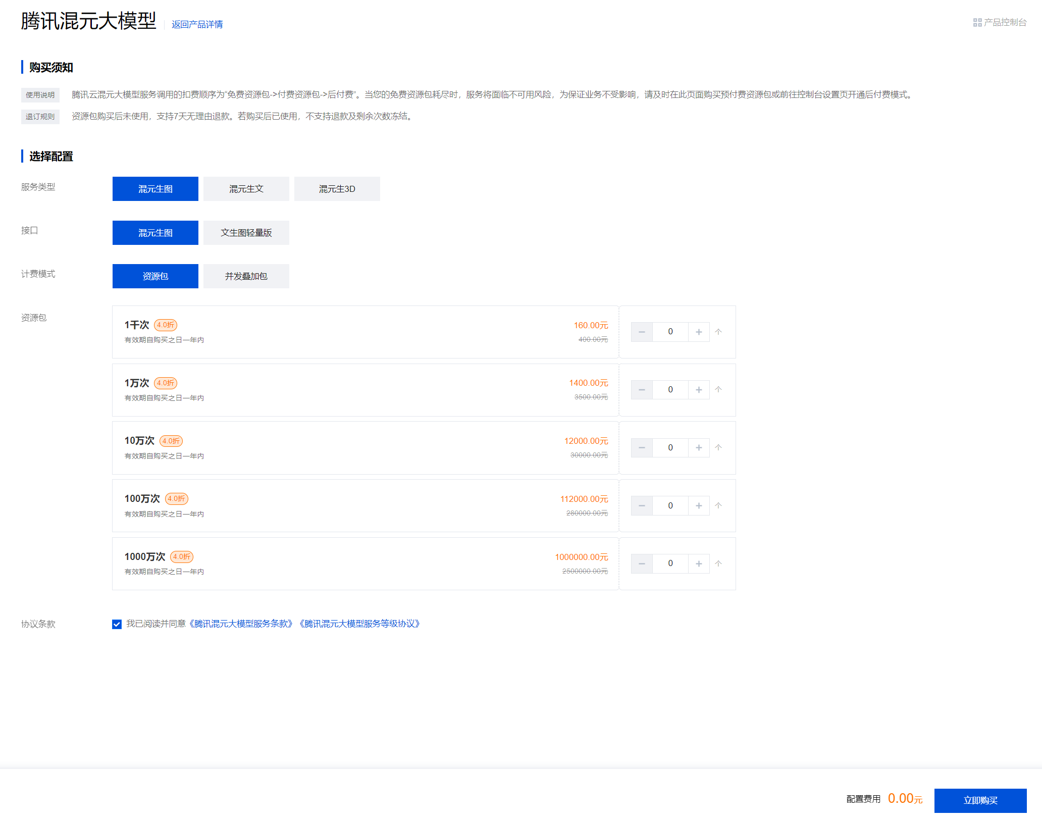 然后我们需要买一点混元生图的资源套餐。