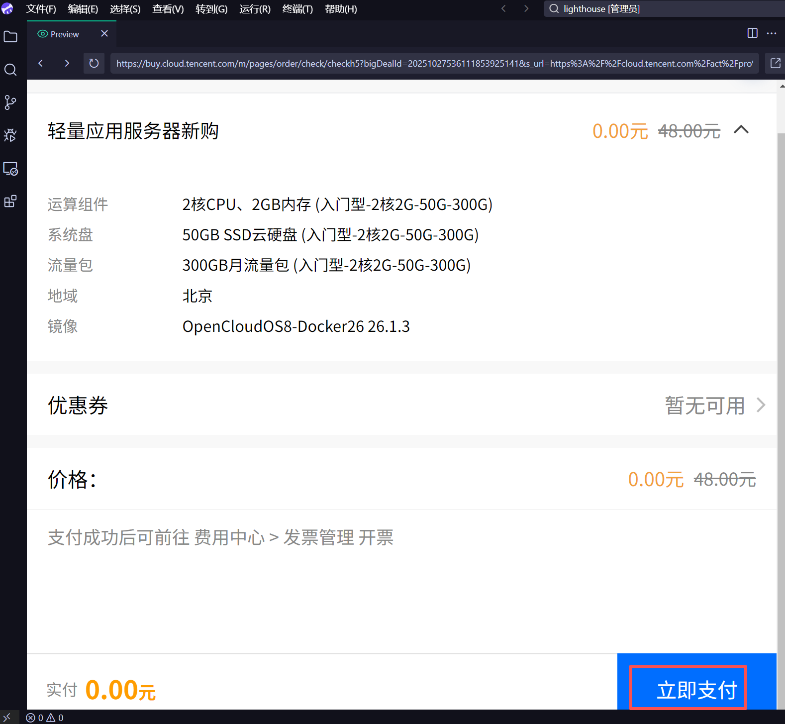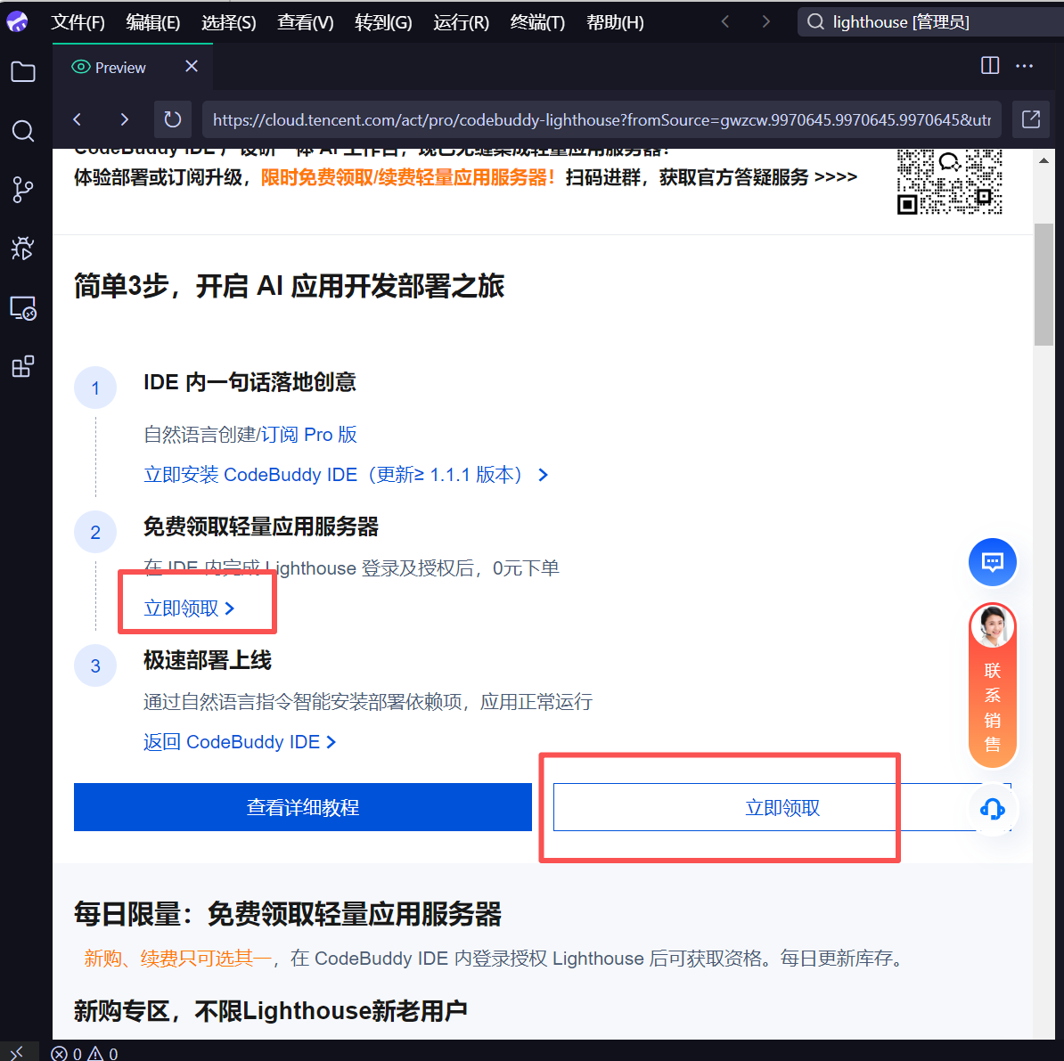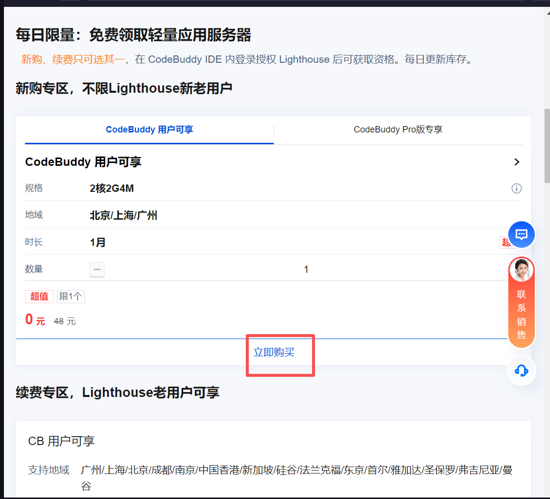 首先我们可以通过CodeBuddy IDE内部授权登录轻量应用服务器领取免费套餐。可以直接聊天问CodeBuddy该怎么做?如下所示
