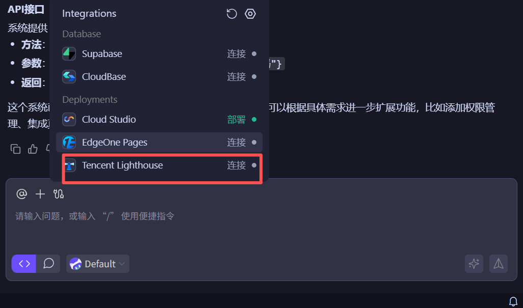 登录授权 Lighthouse 获取资格免费领取轻量应用服务器,需要我们在CodeBuddy聊天对话框中选择Tencent lighthouse并完成连接。