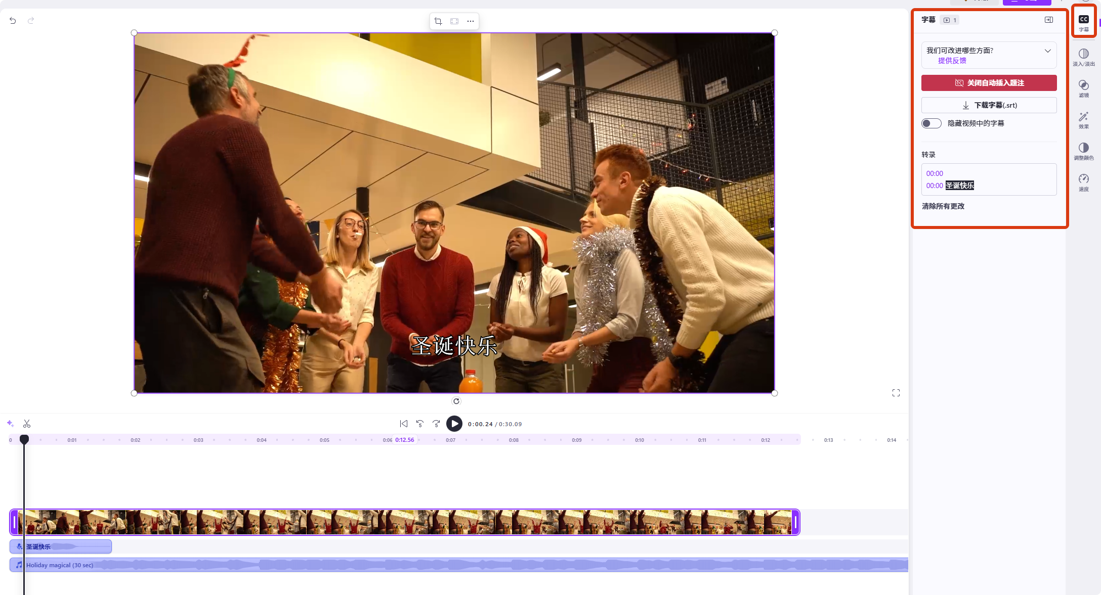 一键字幕: 点击“自动字幕”,生成字幕,并选择一个醒目的颜色。
