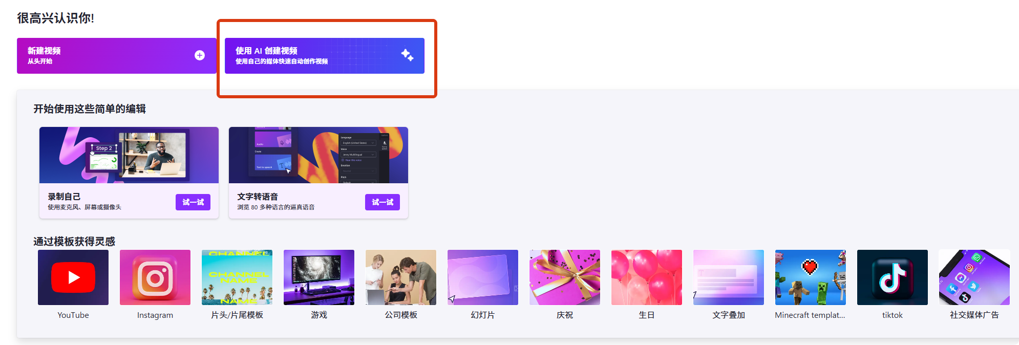 如果你连剪辑都懒得剪,Clipchamp首页有一个“使用AI创建视频” 的按钮。