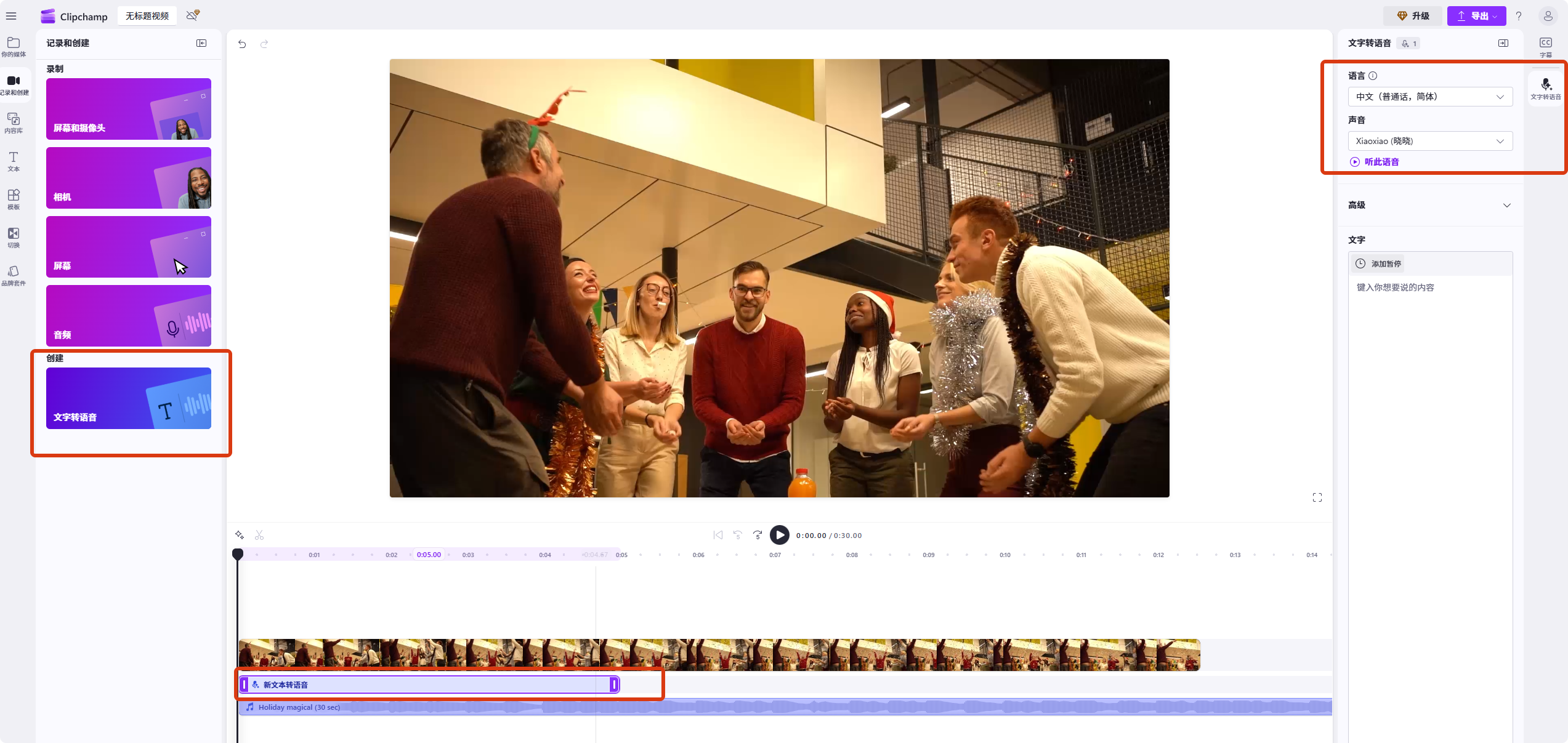 生成配音: 将AI生成的【旁白文案】复制到Clipchamp的“文本转语音”功能中。选择“晓涵”的声音,生成音频并拖入时间轴。