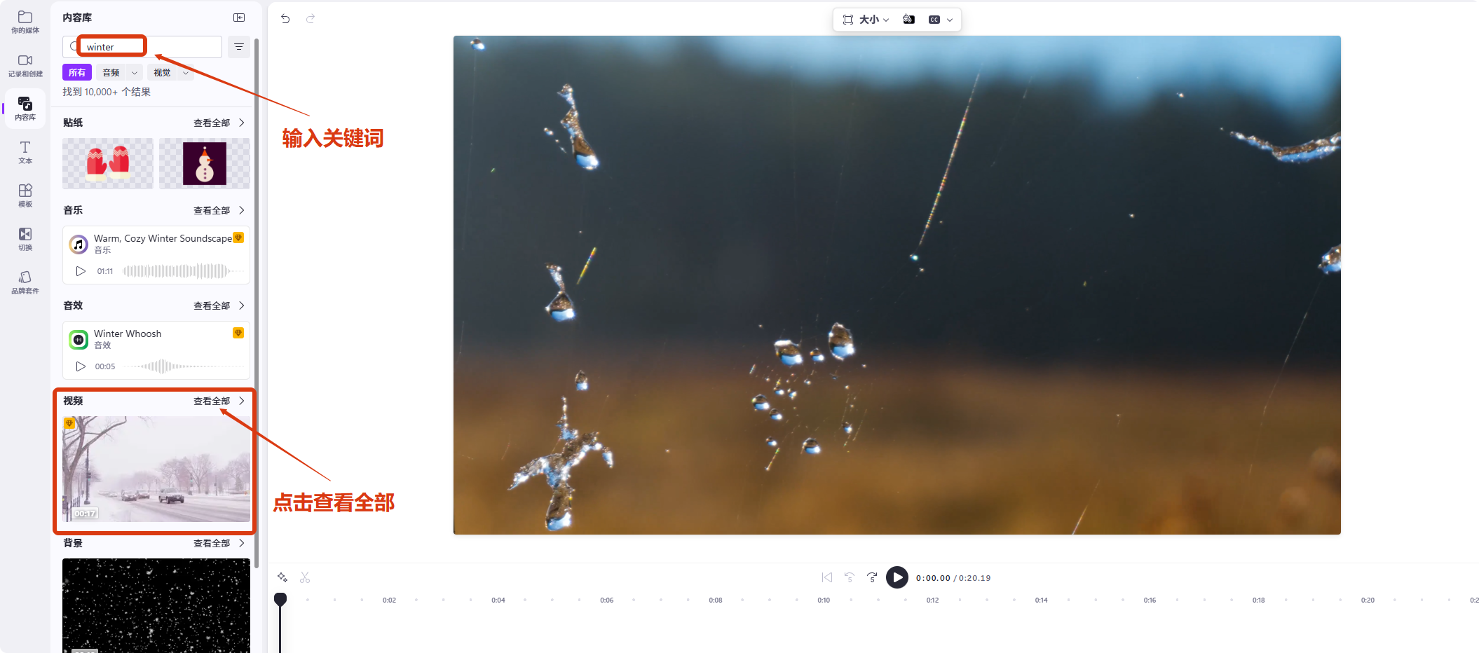 添加BGM: 在“内容库”的音频栏,找一首轻音乐,将音量调低至合适,以免盖过人声。