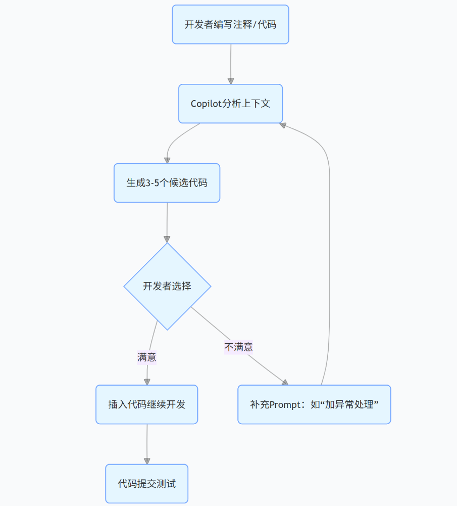 Copilot 并非 “全自动编码”,而是 “建议 - 选择” 机制(见图 2):
