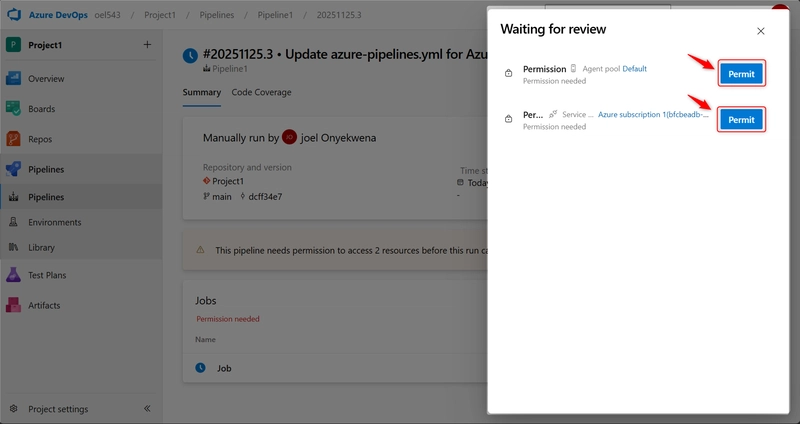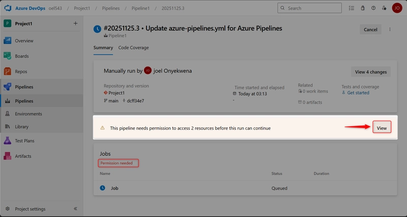 - 如果出现 “需要权限(Permission needed)” 提示(“此管道需要访问 2 个资源才能继续运行”),请选择 “查看(View)”,然后授予所需权限。