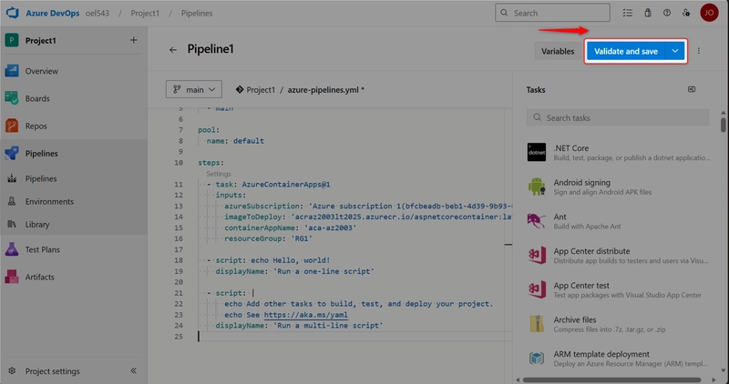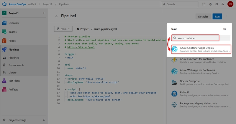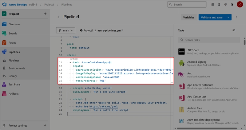 - 你的管道 YAML 文件现在应包含如下 AzureContainerApps 任务:
