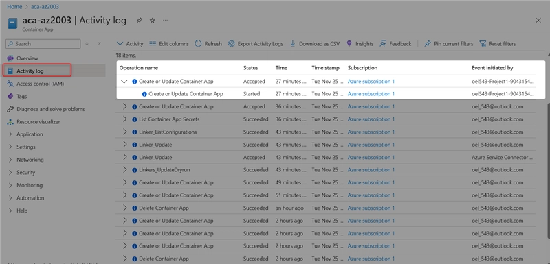 - 验证因运行管道而执行的 “创建或更新容器应用(Create or Update Container App)” 操作是否成功。