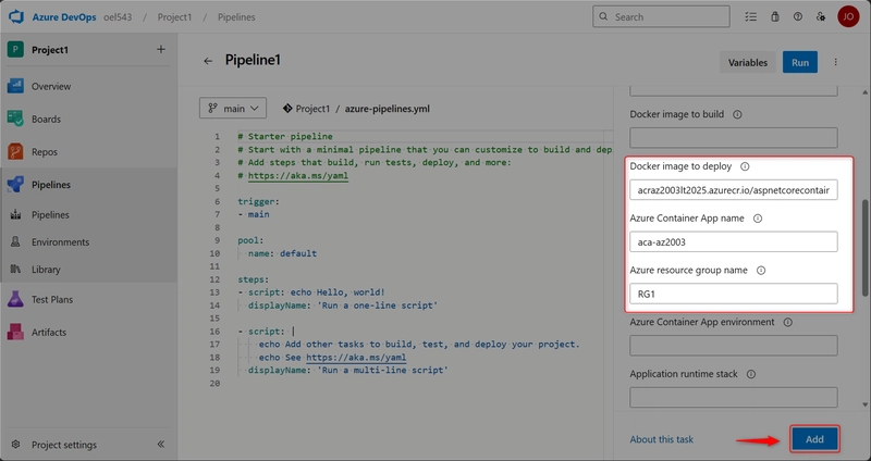 为 Pipeline1 配置 Azure 容器应用部署任务