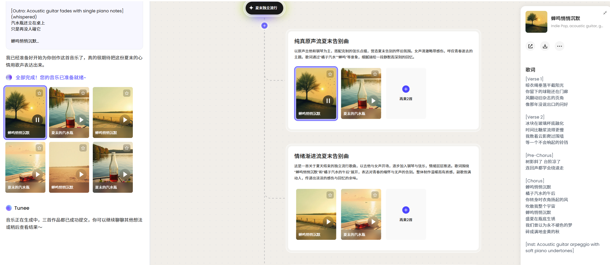 与Suno等音乐生成平台相比,Tunee选择了截然不同的产品路径——它不要做复杂的音乐工作站,而是要成为一个人人可用的智能音乐伙伴。