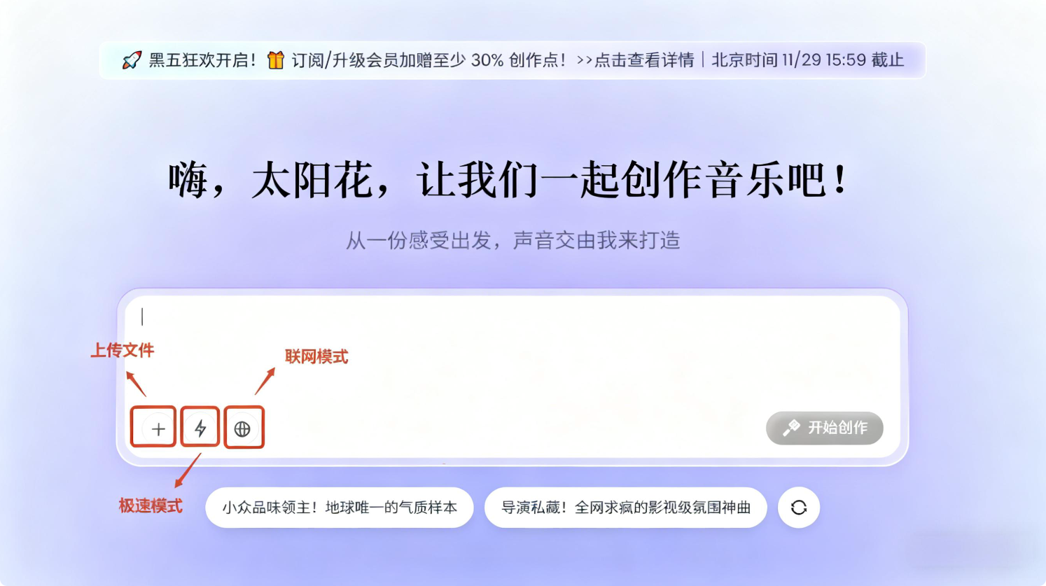 打开Tunee官网,输入框左下角有三个实用按钮:上传文件(支持音视频和图片,AI会从中获取灵感)、极速模式(跳过对话快速生成)、联网模式(让AI能够搜索网络资料)。