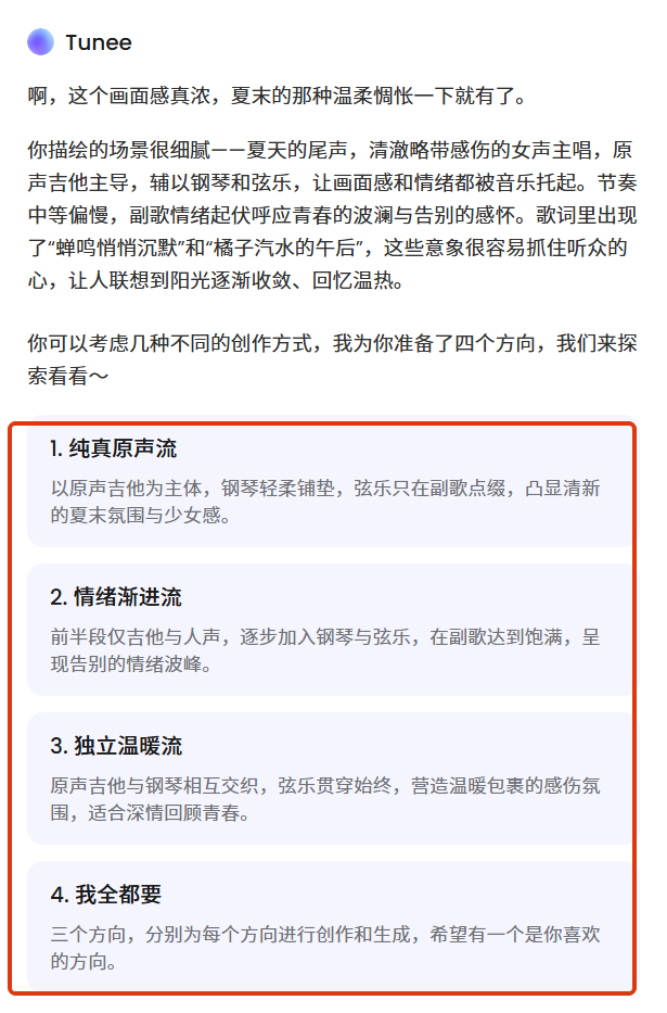 如果你没有灵感,可以直接使用Tunee提供的“创作灵感”随机选择一个起点。