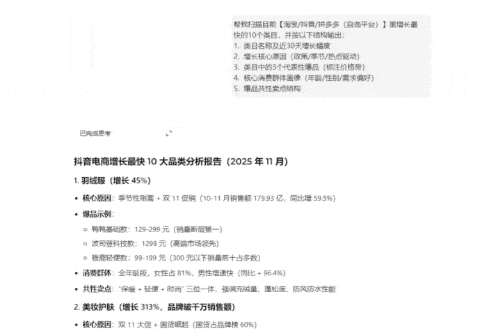 替代“生意参谋-市场分析”的人工筛选工作,直接获得类目增长底层逻辑,避免盲目进入红海赛道。