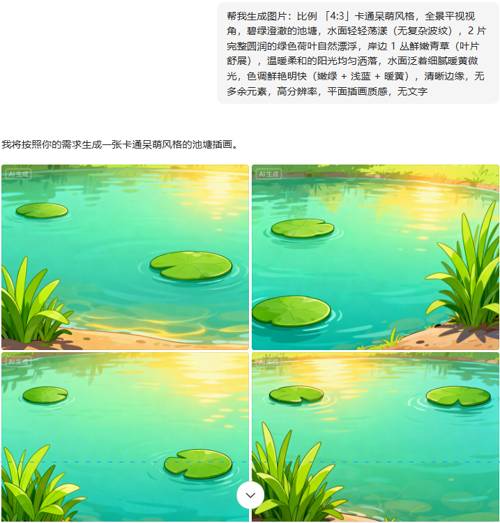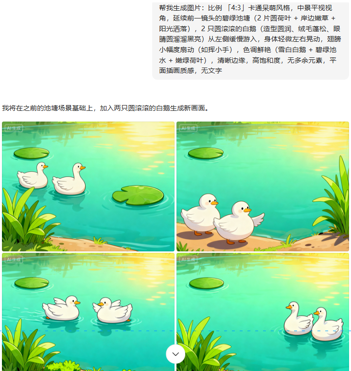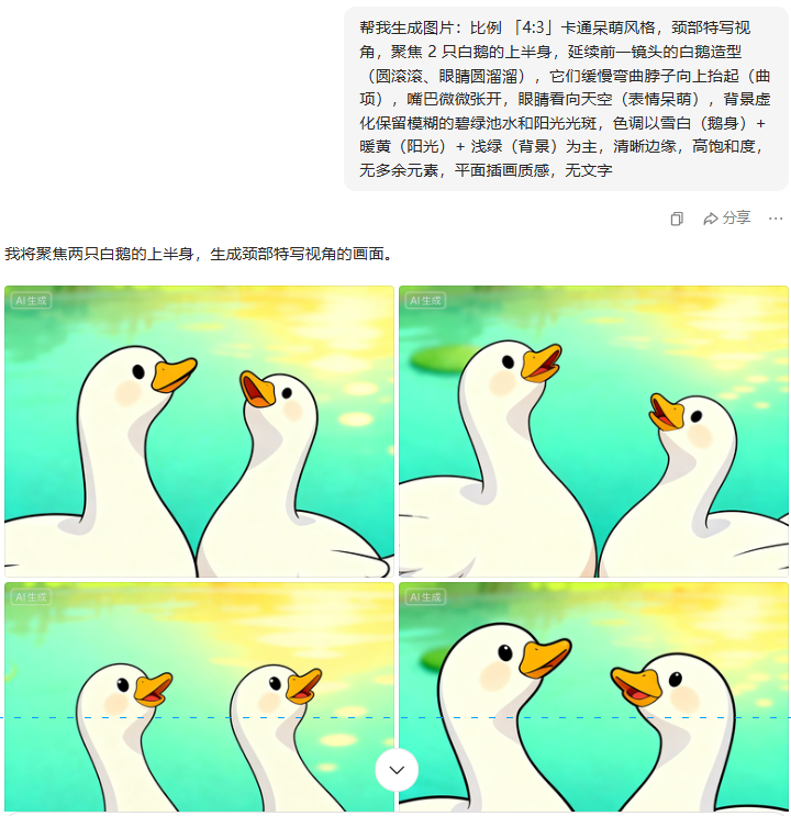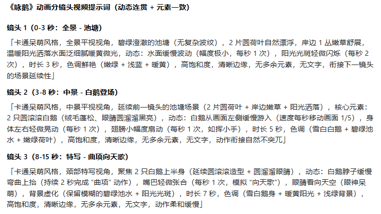 (1)脚本撰写:打开豆包,输入需求“帮我写一个 30 秒的《咏鹅》动画脚本,面向 4-5 岁幼儿,场景包含池塘、白鹅、绿水、红掌,动作简单”,快速生成脚本。