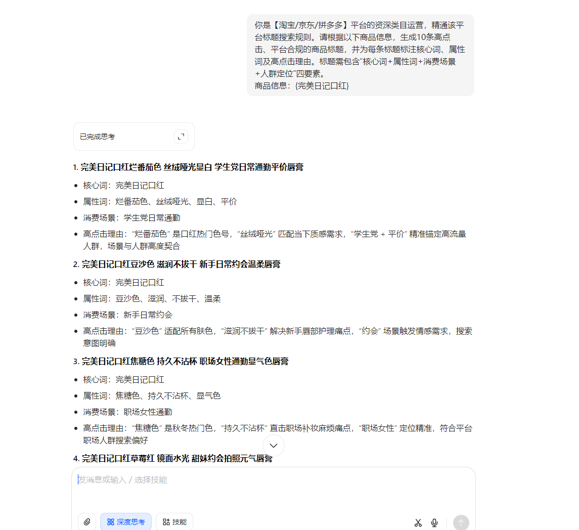 1. 用“场景1”提示词生成10条商品标题,筛选3条最优;