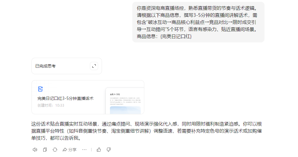 3. 用“场景4”提示词撰写直播话术,适配当日直播场次。