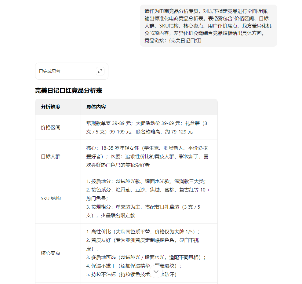 自动生成竞品分析表,覆盖价格、人群、SKU、评价痛点等核心维度,快速定位差异化机会。