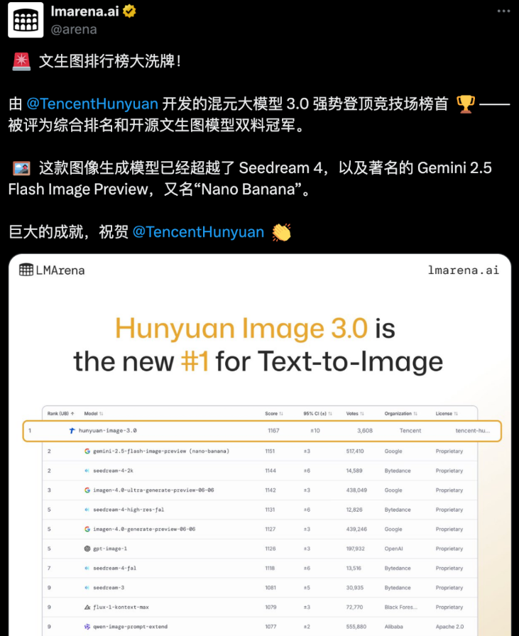 就在最近,全球最权威的AI竞技场之一——由加州大学伯克利分校主导的LMArena平台,公布了其文生图榜单的最新结果。出乎许多人意料,登顶榜首的并非大家熟知的Midjourney或谷歌、OpenAI的最新力作,而是一个来自中国的名字:腾讯混元图像3.0。