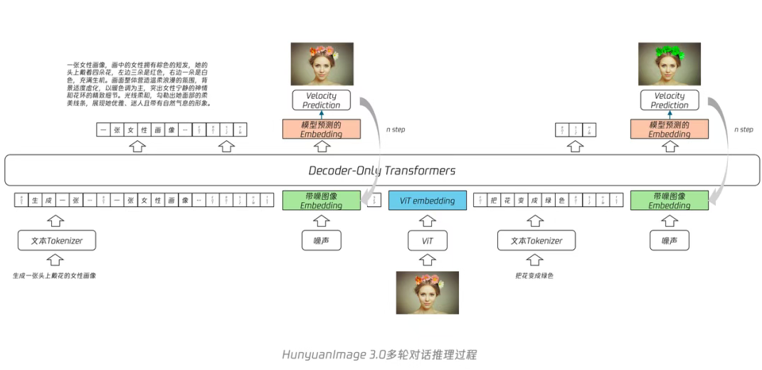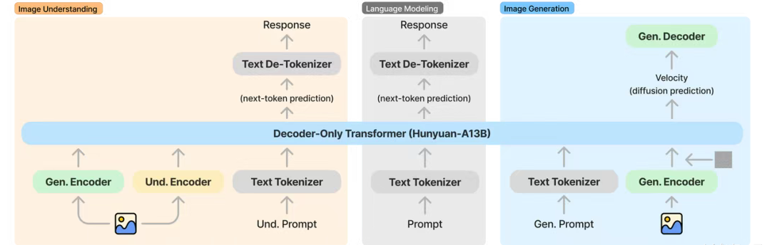 首先,它是一个“原生思想家”,而非“拼接工具人”。很多早期的多模态模型,更像是将一个强大的语言模型(负责理解)和一个强大的图像模型(负责绘画)“粘”在一起。而混元采用的“原生多模态架构”,从设计之初就让模型同时具备语言的思考能力和图像的生成能力。官方提出的“Transfusion”机制,深度耦合了Transformer的长文本理解能力和Diffusion的图像生成能力,使其“大脑”和“双手”能够协同一致地工作。这就像一个自带哲学思想的画家,而不是一个听指令干活的画匠。
