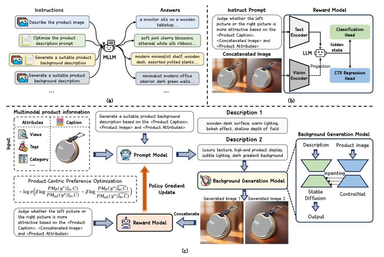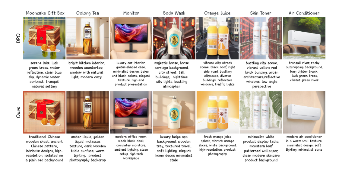 为此,研究者提出了革命性的 “以产品为中心的偏好优化”策略 。简单说,就是在训练中故意给AI“捣乱”,例如将口红的图片和运动鞋的标题混搭,然后要求AI识别并坚持生成与产品本身匹配的背景。这迫使AI必须牢牢抓住产品本身的多模态信息(是什么产品、有什么特点),将其作为创意不可动摇的“锚点”,从而在提升吸引力的同时,保证背景的相关性与协调性,杜绝“运动口红”式的荒谬生成。