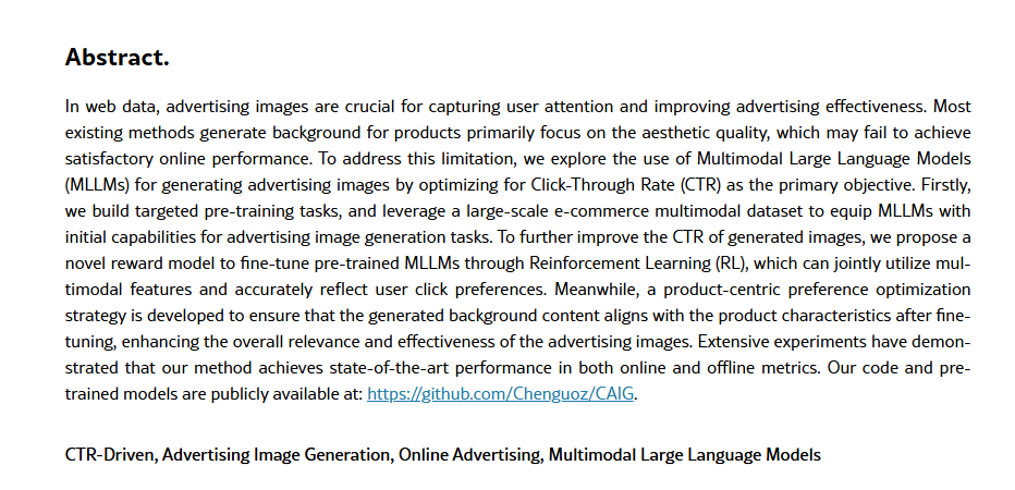 这背后,隐藏着一场关于“吸引力”的精密计算。如今,一场由多模态大模型(MLLMs)驱动的变革正在发生:AI不再仅仅追求把广告图片做得更“美”,而是开始学习人类的点击偏好,直接为“效果”而生成。