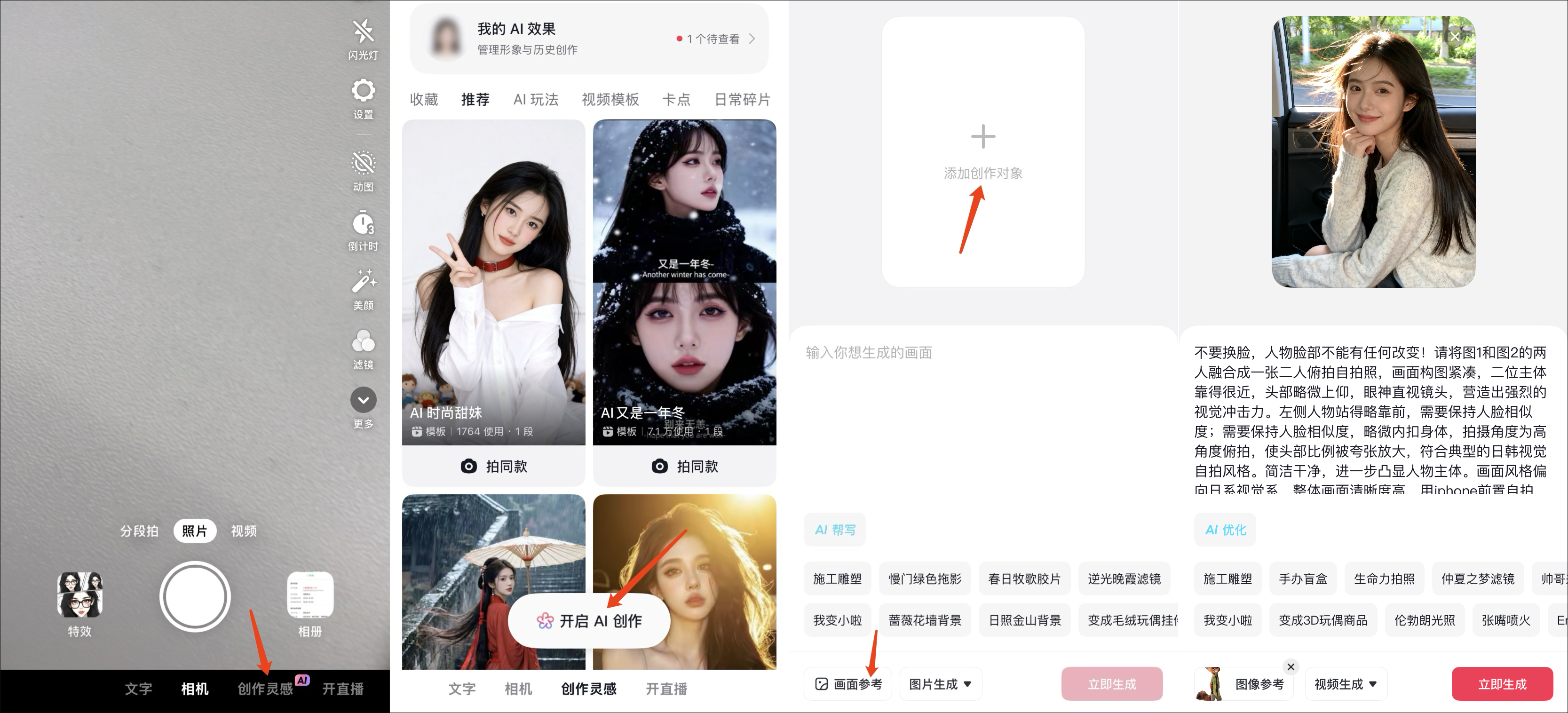 2.搜索特效:点击抖音的“+”后,选择“创作灵感”,再选择“开启AI创作”。