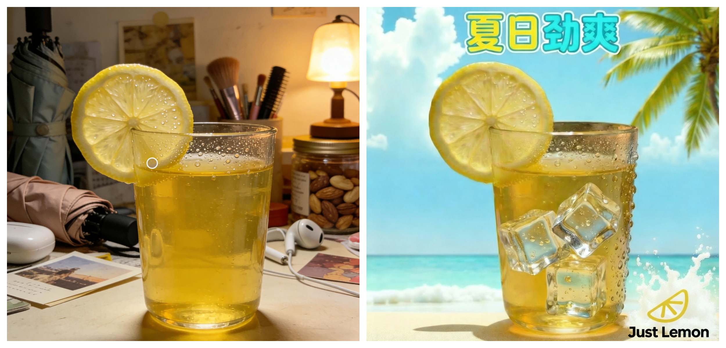 输入指令(套用黄金公式):“请把这张图中的柠檬茶产品抠出来,换成热带海滩背景。背景要有蓝天、白云和飞溅的水花,体现清凉解渴的感觉。整体色调要明亮清新,并在顶部加上设计感的文字‘夏日劲爽’。”