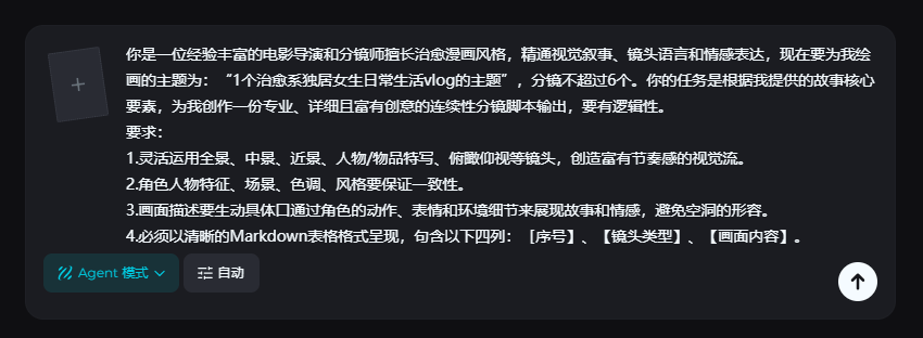 - 将写好的提示词输入Agent后,等待生成分镜画面。