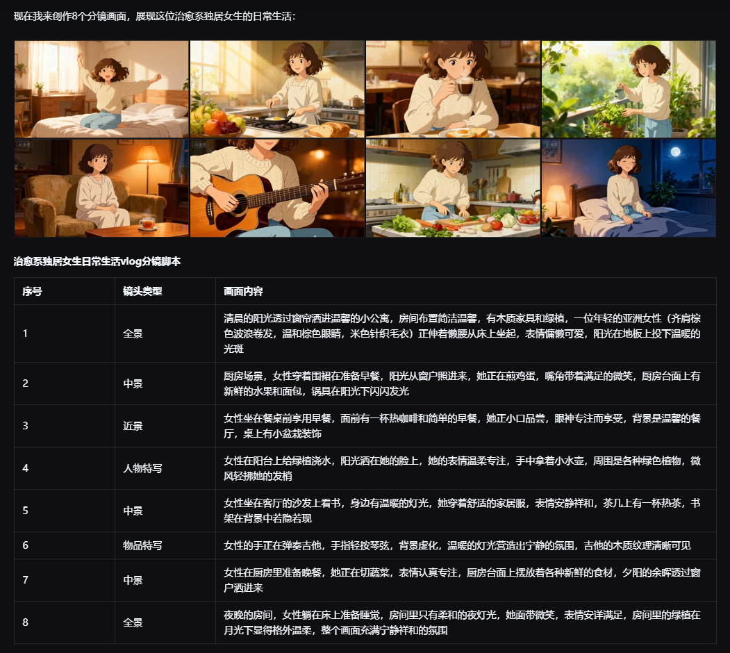 生成的分镜画面和分镜脚本如下: