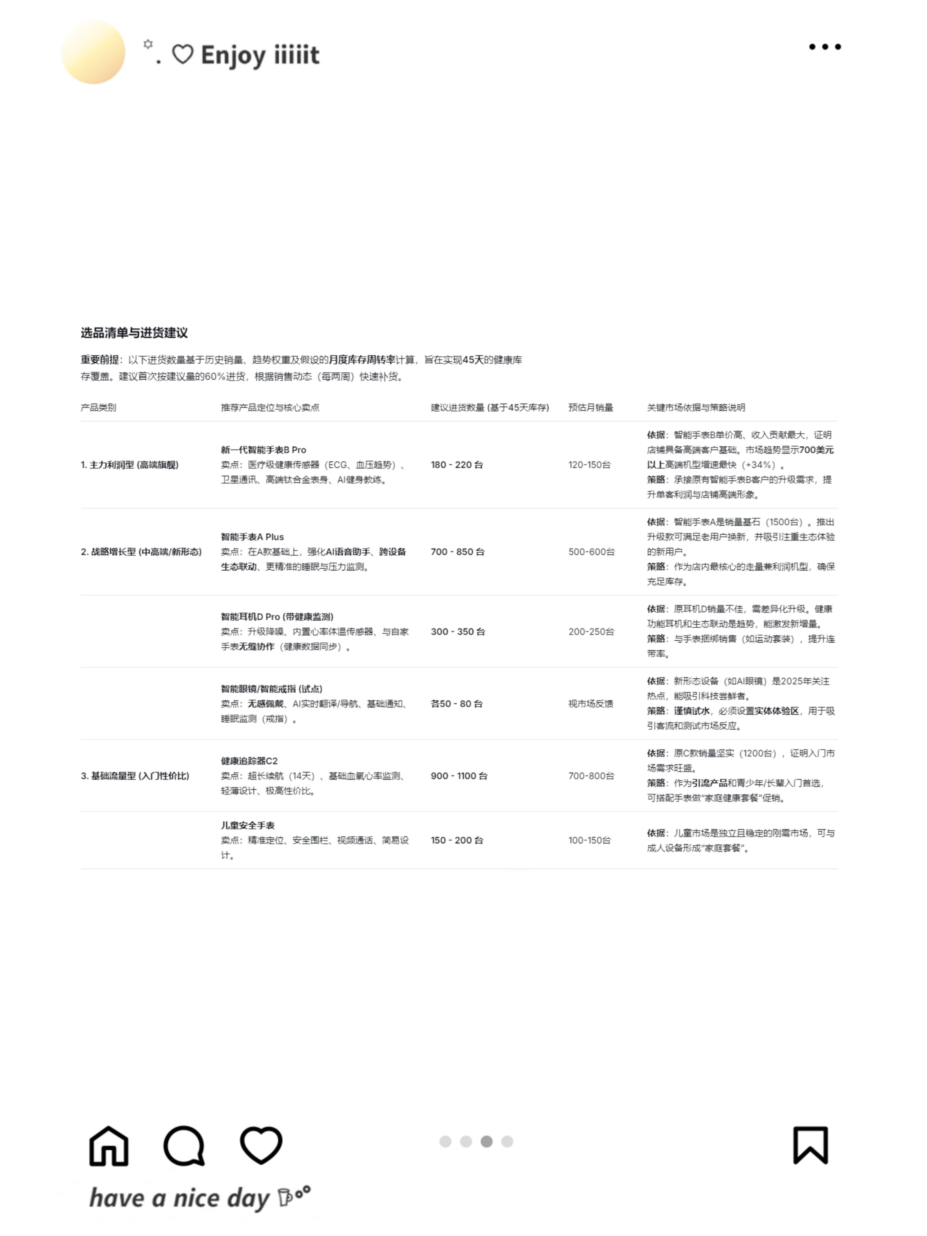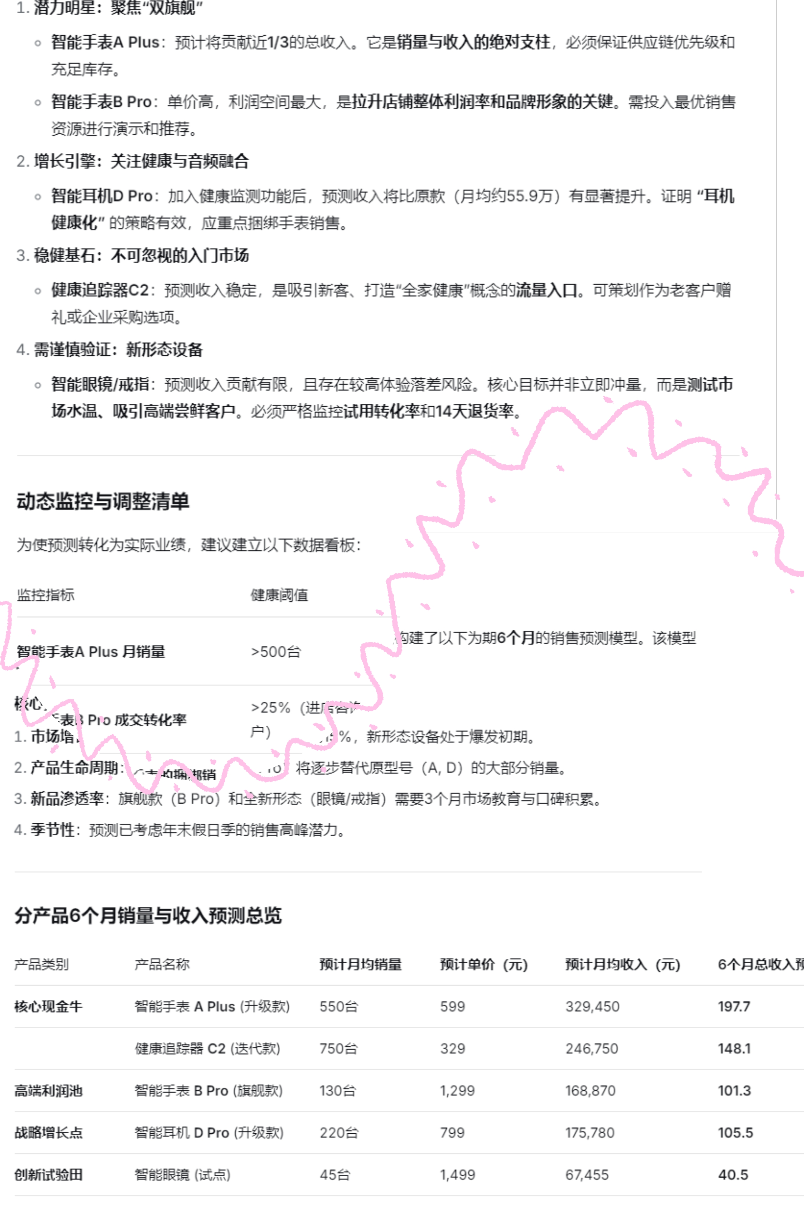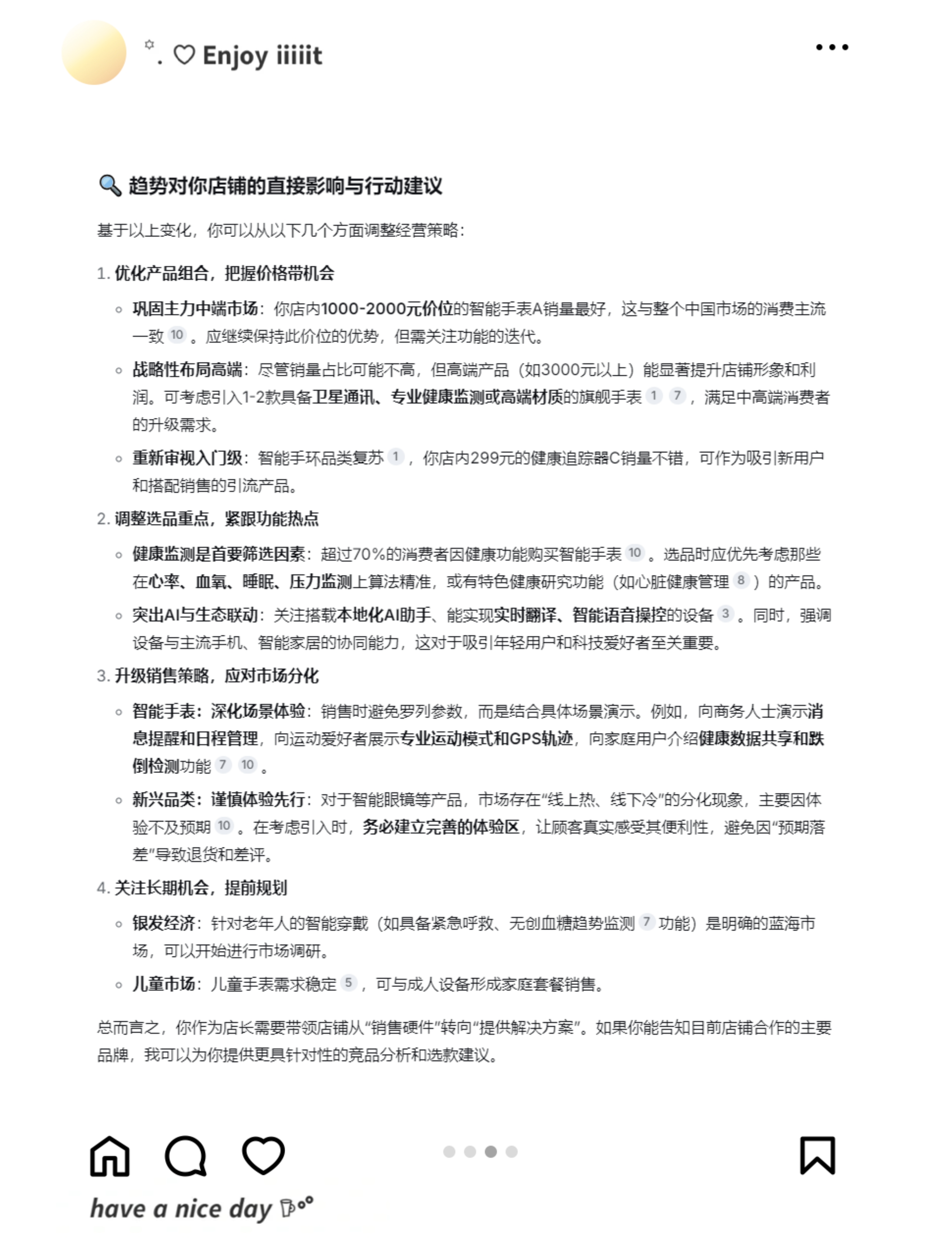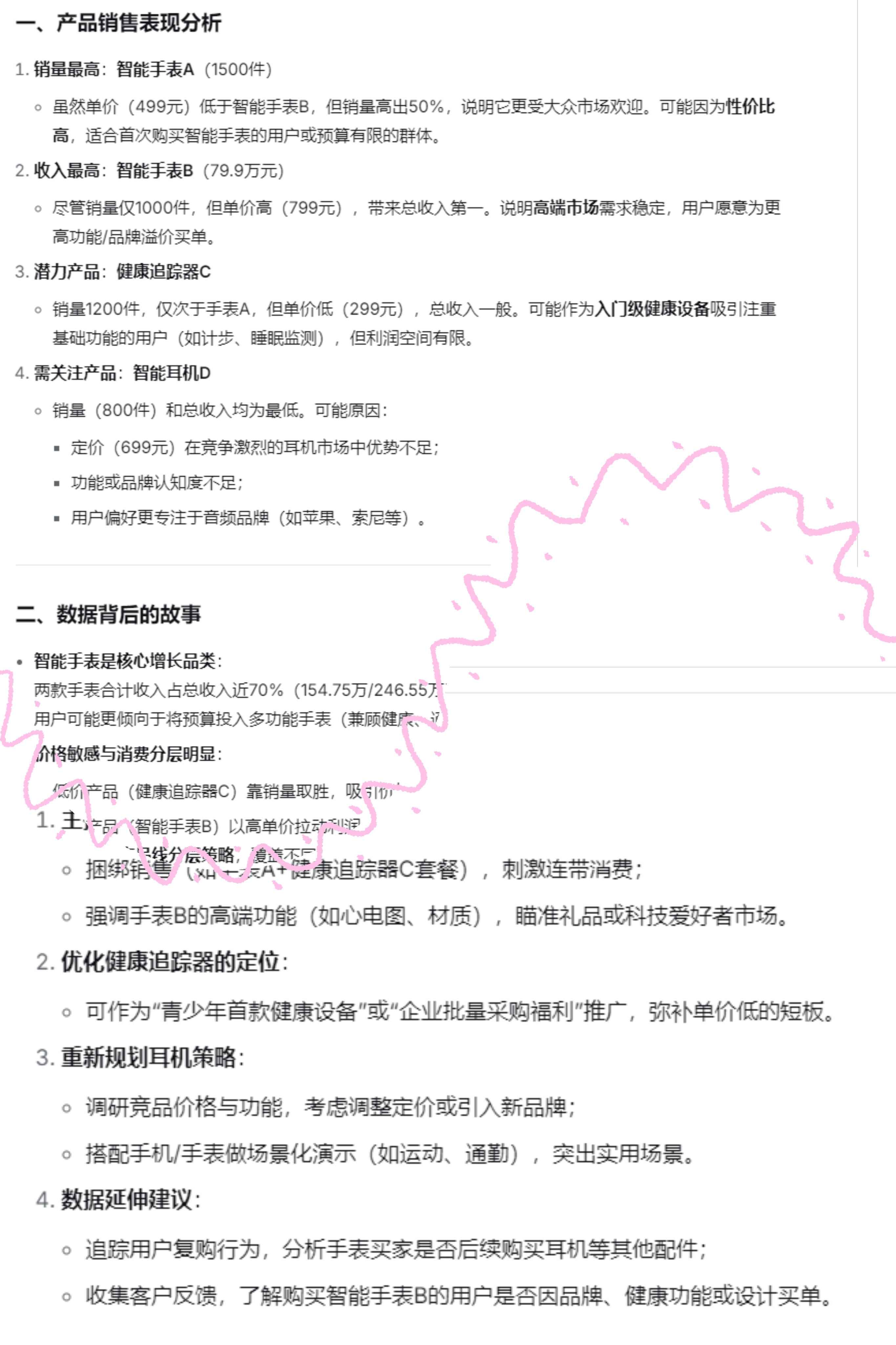 通过这些分析,AI自动推荐我们加大对智能手表和健康追踪器的采购量。看到这些趋势,作为店长的你是不是也有些小激动呢?