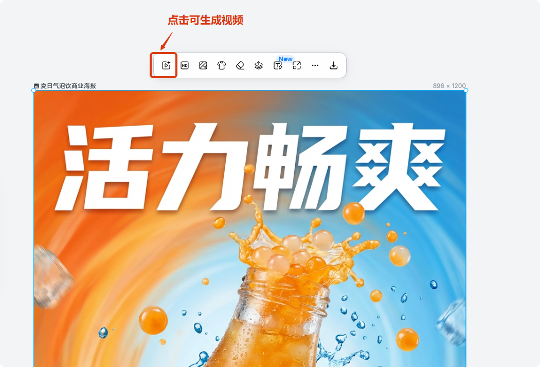 你的指令:“基于这张海报,生成一段5秒的短视频。镜头从瓶身的冷凝水珠特写拉出,展示整个飞溅气泡的背景,最后定格在广告语上,节奏动感有活力。”